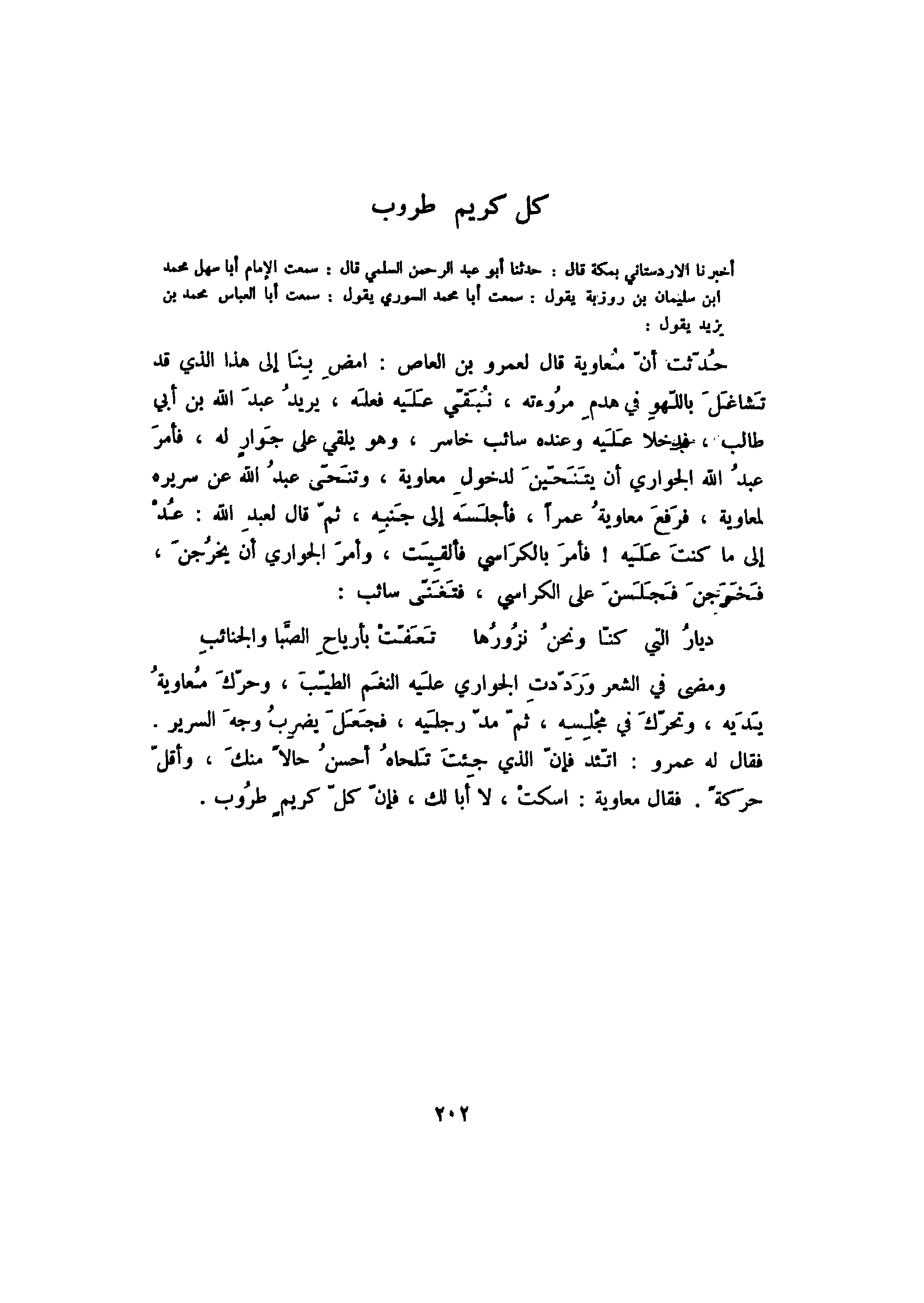 فقال له عمرو: اتئد فإن الذي جئت تلحاه أحسن حالاً منك، وأقل حركةً. فقال معاوية: اسكت، لا أبا لك، فإن كل كريم طروب.