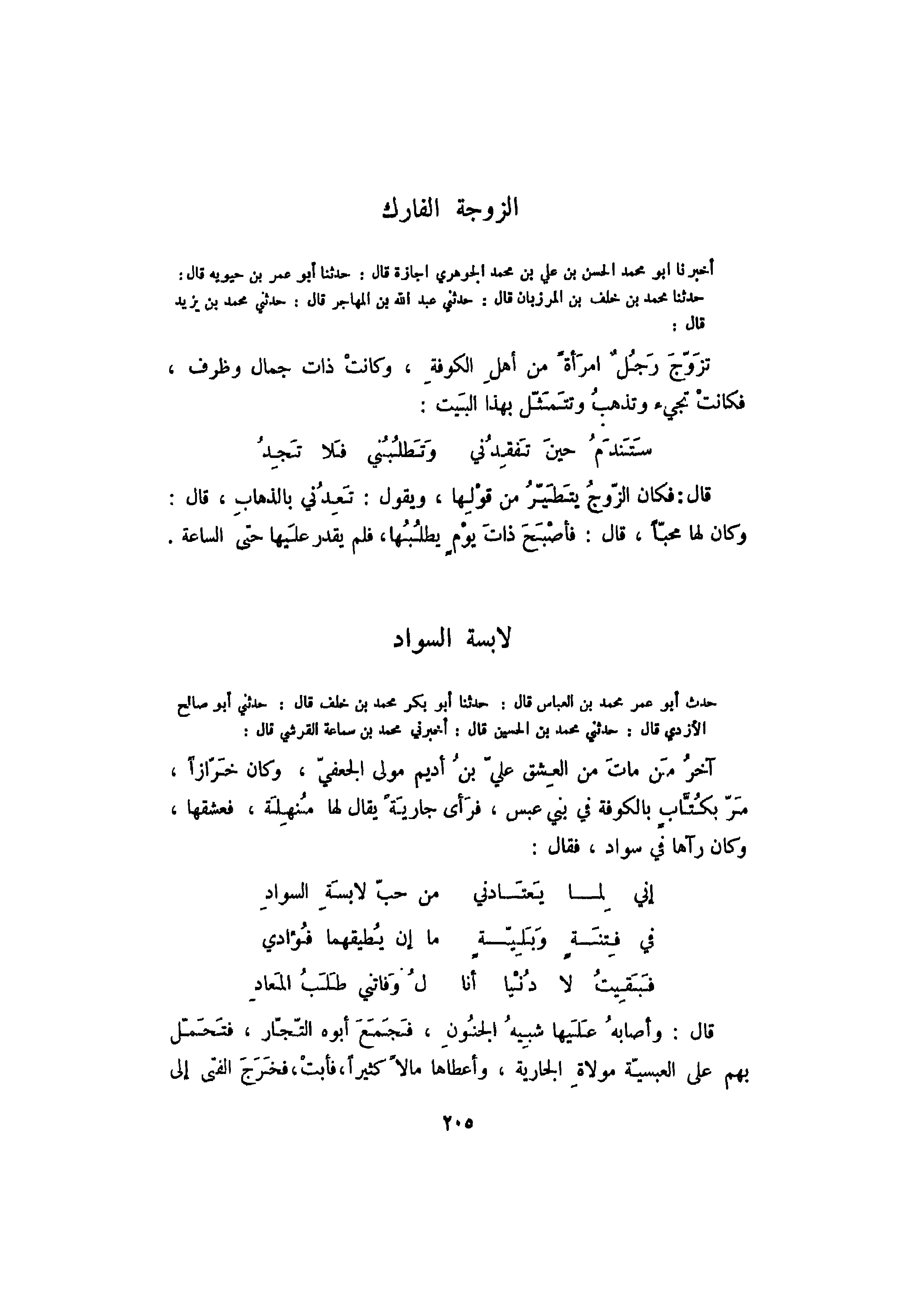 أخبرنا أبو محمد الحسن بن علي بن محمد الجوهري إجازة قال: حدثنا أبو عمر بن حيويه قال: حدثنا محمد بن خلف بن المرزبان قال: حدثني عبد الله بن المهاجر قال: حدثني محمد بن يزيد قال: تزوج رجل امرأةً من أهل الكوفة، وكانت ذات جمال وظرف، فكانت تجيء وتذهب وتتمثل بهذا البيت: