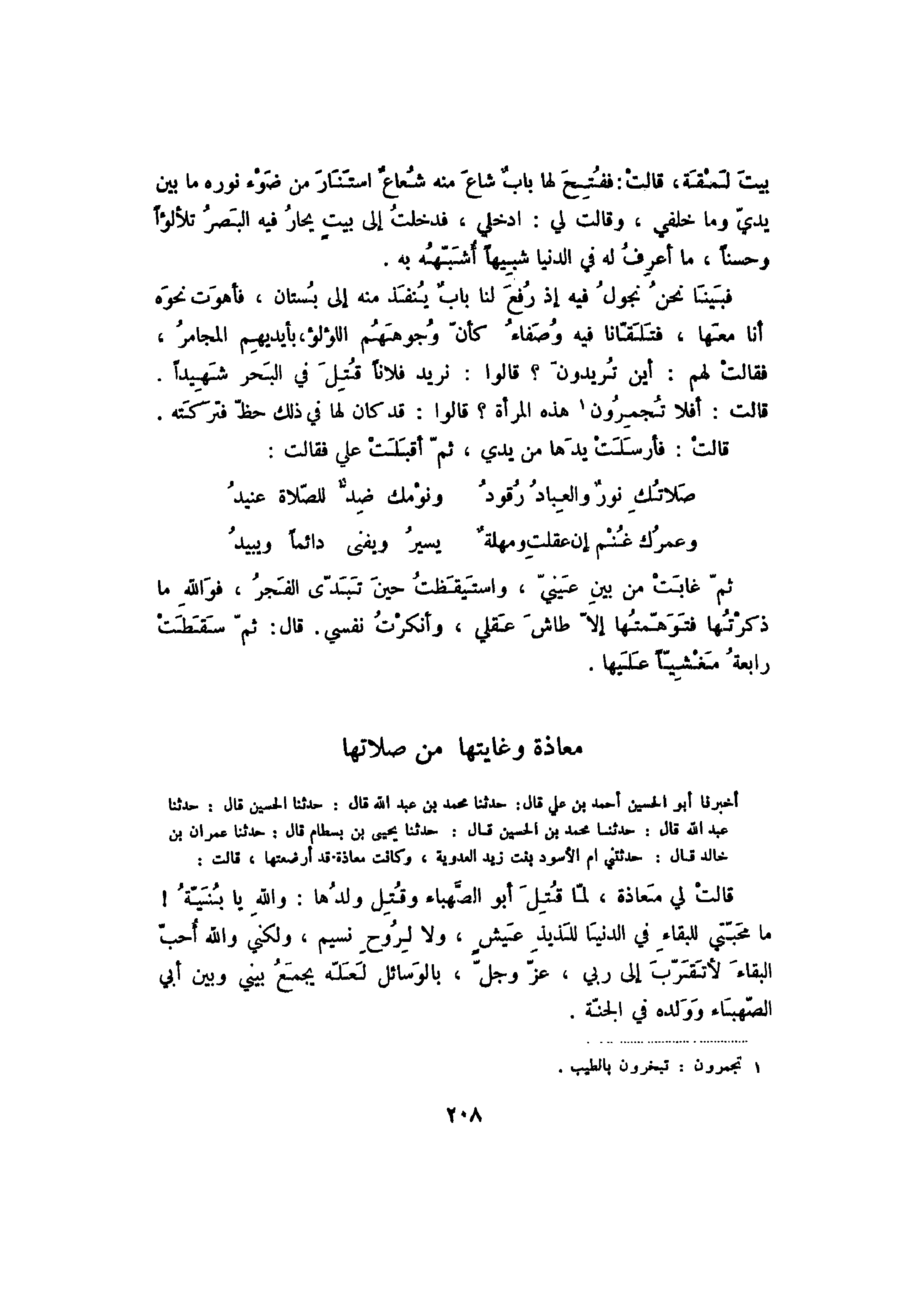 فبينا نحن نجول فيه إذ رفع لنا باب ينفذ منه إلى بستان، فأهوت نحوه أنا معها، فتلقانا فيه وصفاء كأن وجوههم اللؤلؤ، بأيديهم المجامر، فقالت لهم: أين تريدون؟ قالوا: نريد فلاناً قتل في البحر شهيداً.