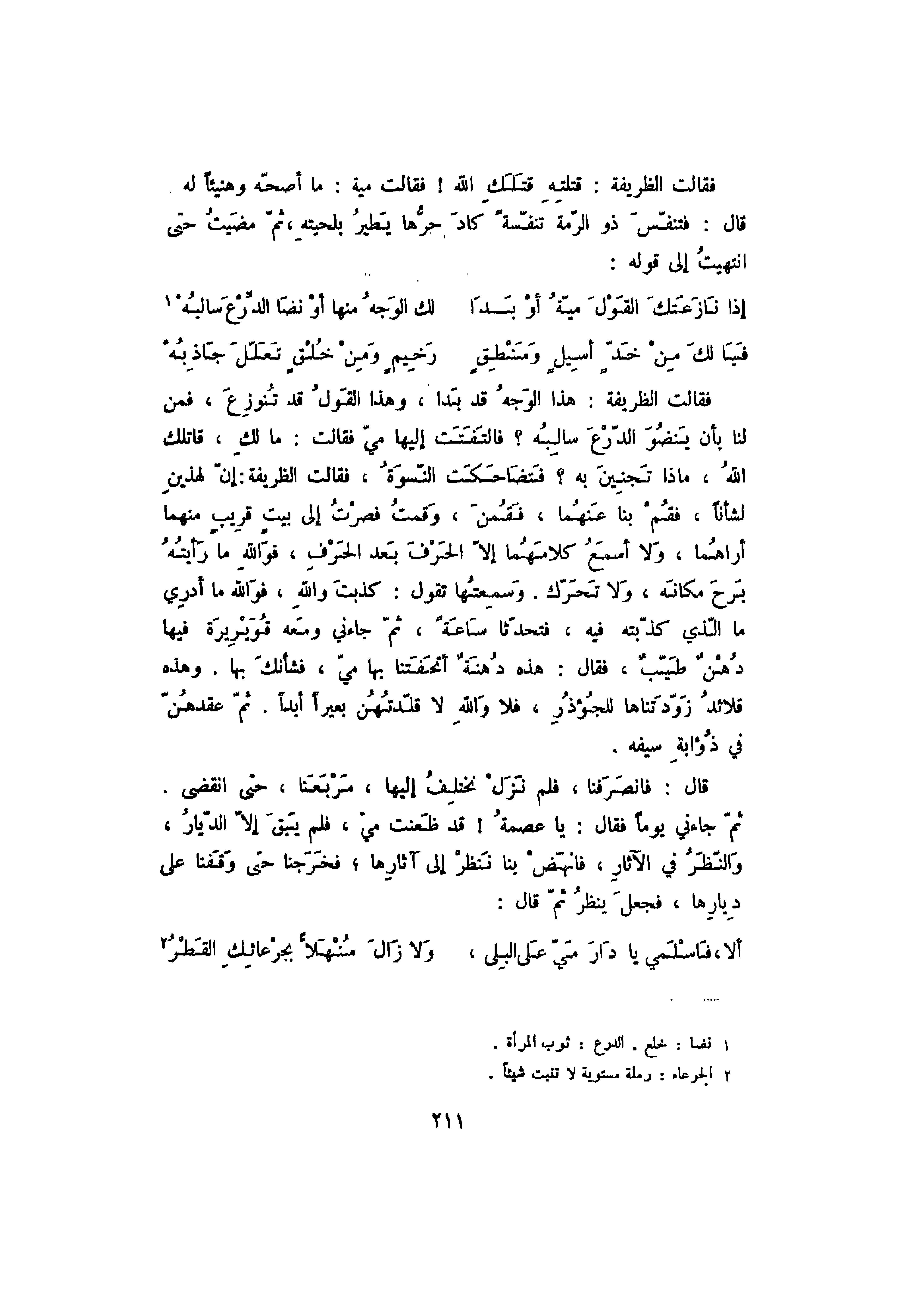فقالت الظريفة: قتلته قتلك الله! فقالت مية: ما أصحه وهنيئاً له.