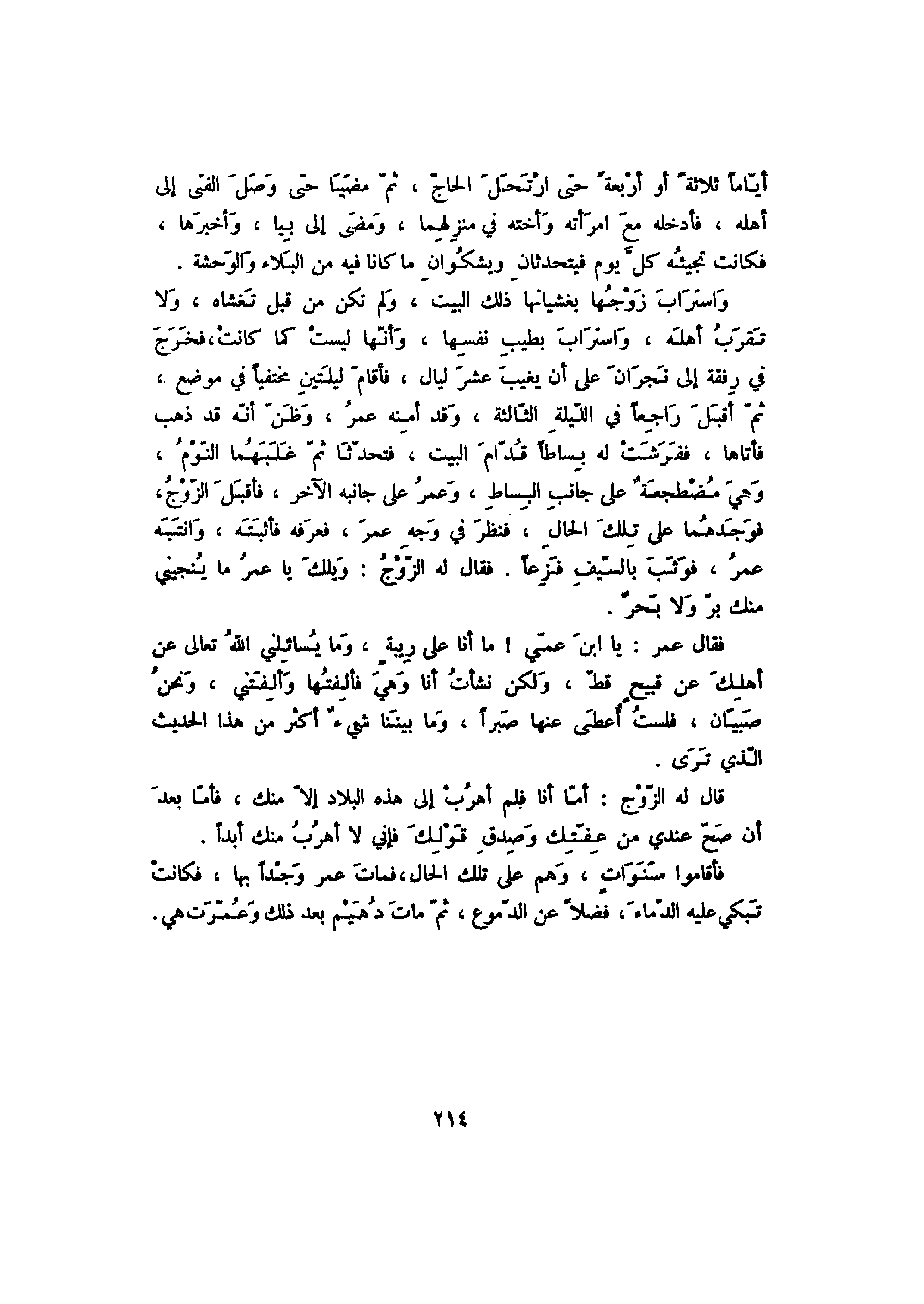 قال له الزوج: أما أنا فلم أهرب إلى هذه البلاد إلا منك، فأما بعد ان صح عندي من عفتك وصدق قولك فإني لا أهرب منك أبداً.