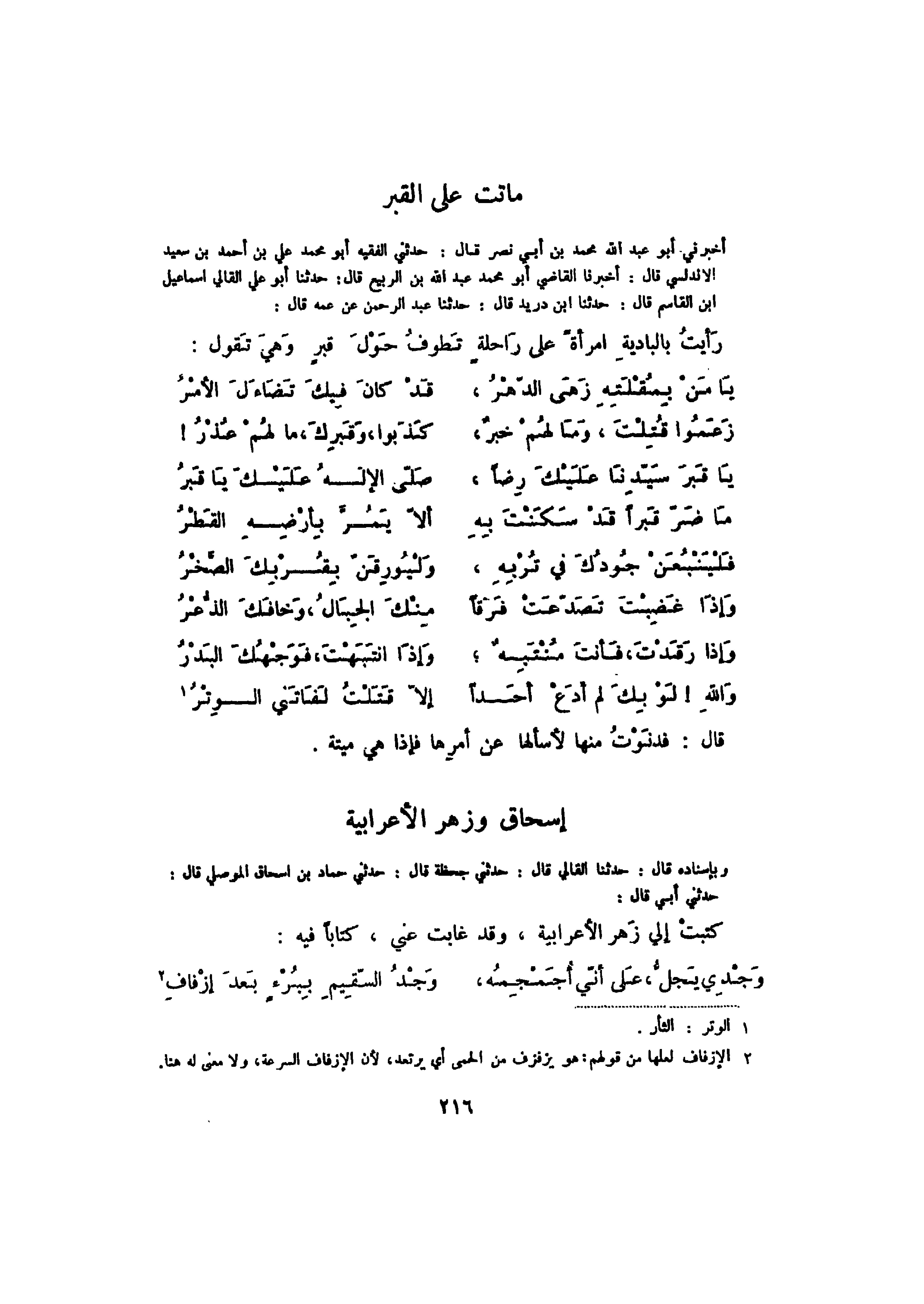 أخبرني أبو عبد الله محمد بن أبي نصر قال: حدثني الفقيه أبو محمد بن أحمد بن سعيد الأندلسي قال: أخبرنا القاضي أبو محمد عبد الله بن الربيع قال: حدثنا أبو علي القالي إسماعيل بن القاسم قال: حدثنا ابن دريد قال: حدثنا عبد الرحمن عن عمه قال: رأيت بالبادية امرأةً على راحلةٍ تطوف حول قبر وهي تقول: