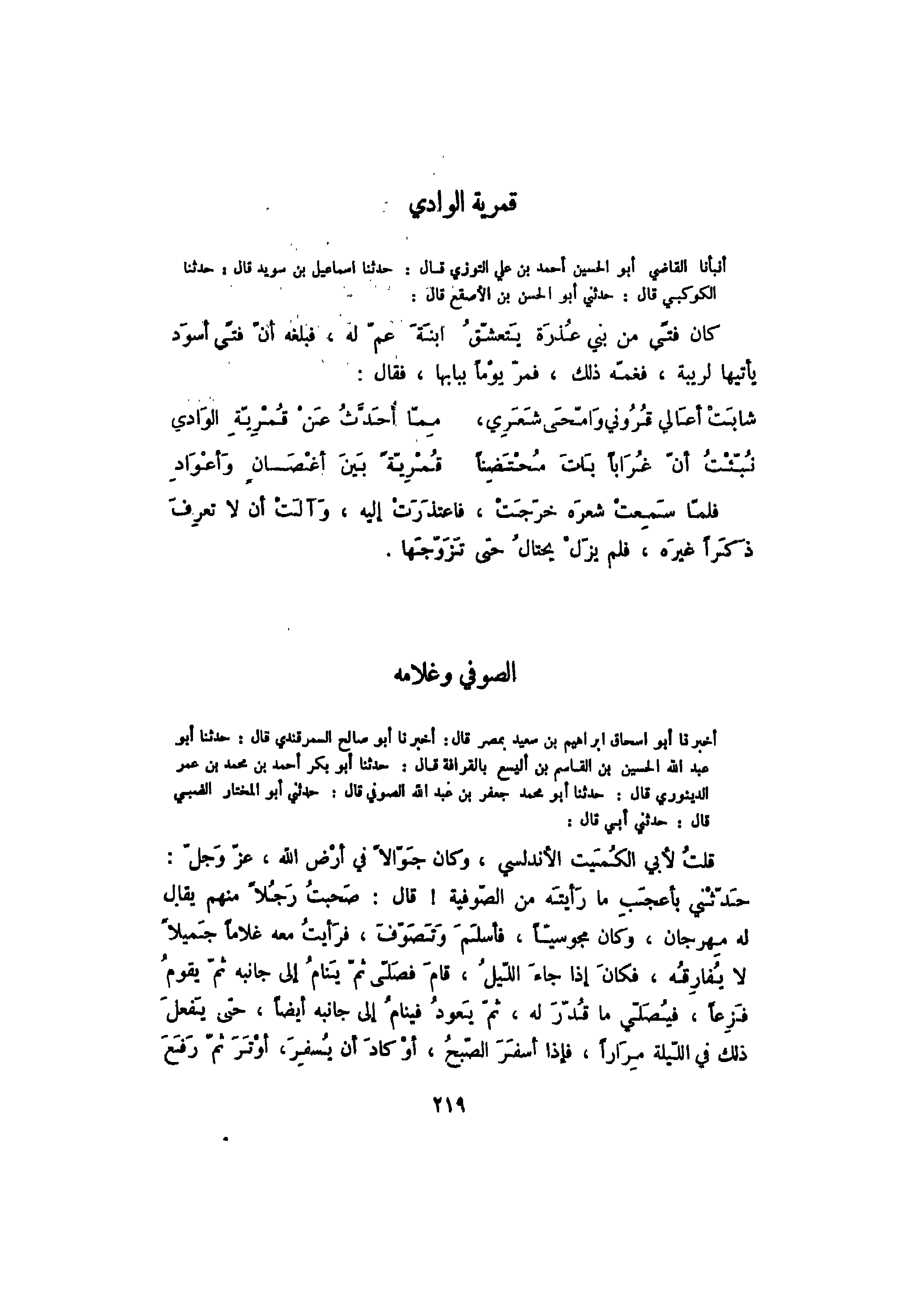 أنبأنا القاضي أبو الحسين أحمد بن علي التوزي قال: حدثنا إسماعيل بن سويد قال: حدثنا الكوكبي قال: حدثني أبو الحسن بن الأصقع قال: كان فتىً من بني عذرة يتعشق ابنة عم له، فبلغه أن فتىً أسود يأتيها لريبة، فغمه ذلك، فمر يوماً ببابها، فقال: