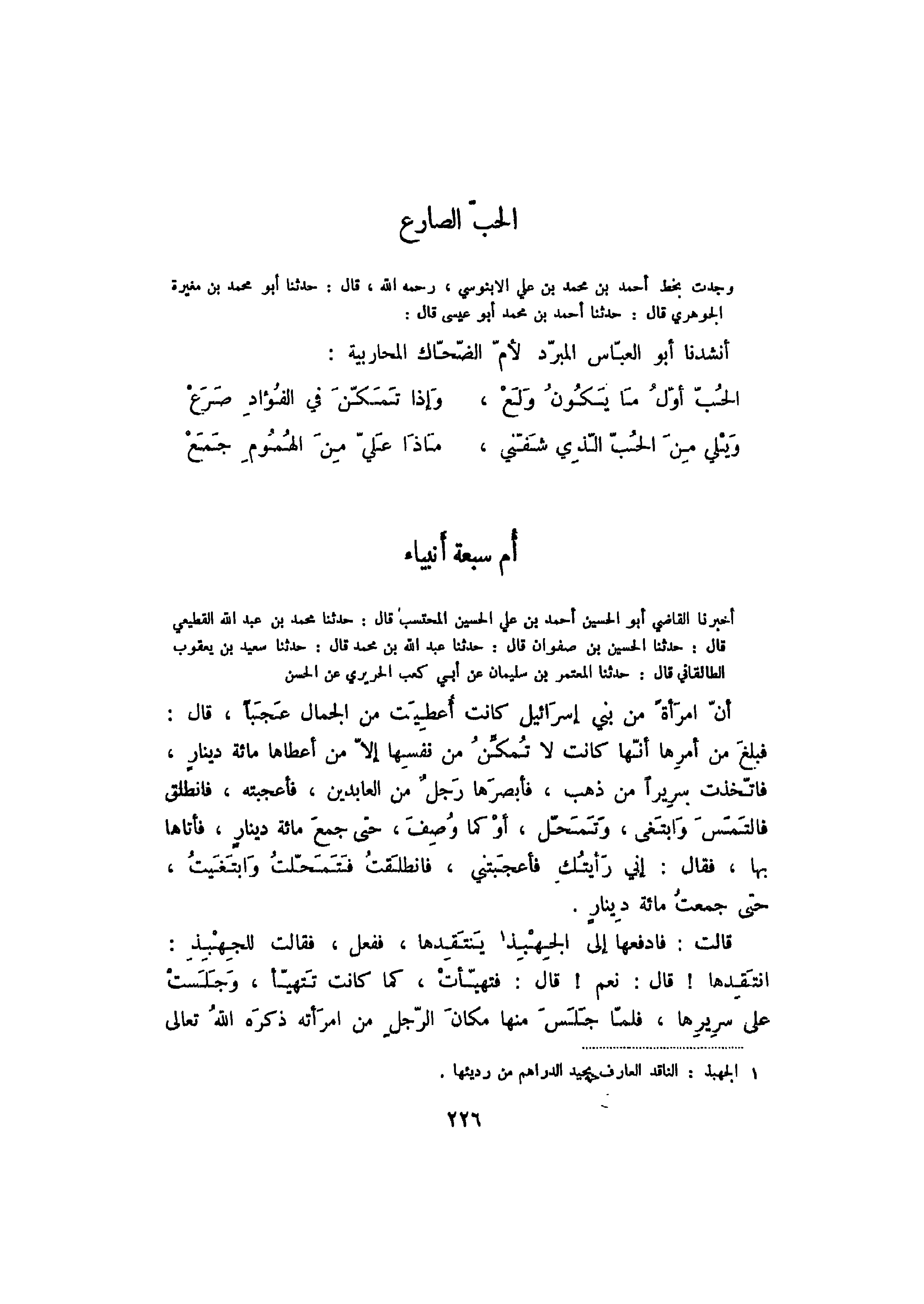 وجدت بخط أحمد بن محمد بن علي الأبنوسي، رحمه الله، قال: حدثنا أبو محمد بن مغيرة الجوهري قال: حدثنا أحمد بن محمد أبو عيسى قال: أنشدنا أبو العباس المبرد لأم الضحاك المحاربية: