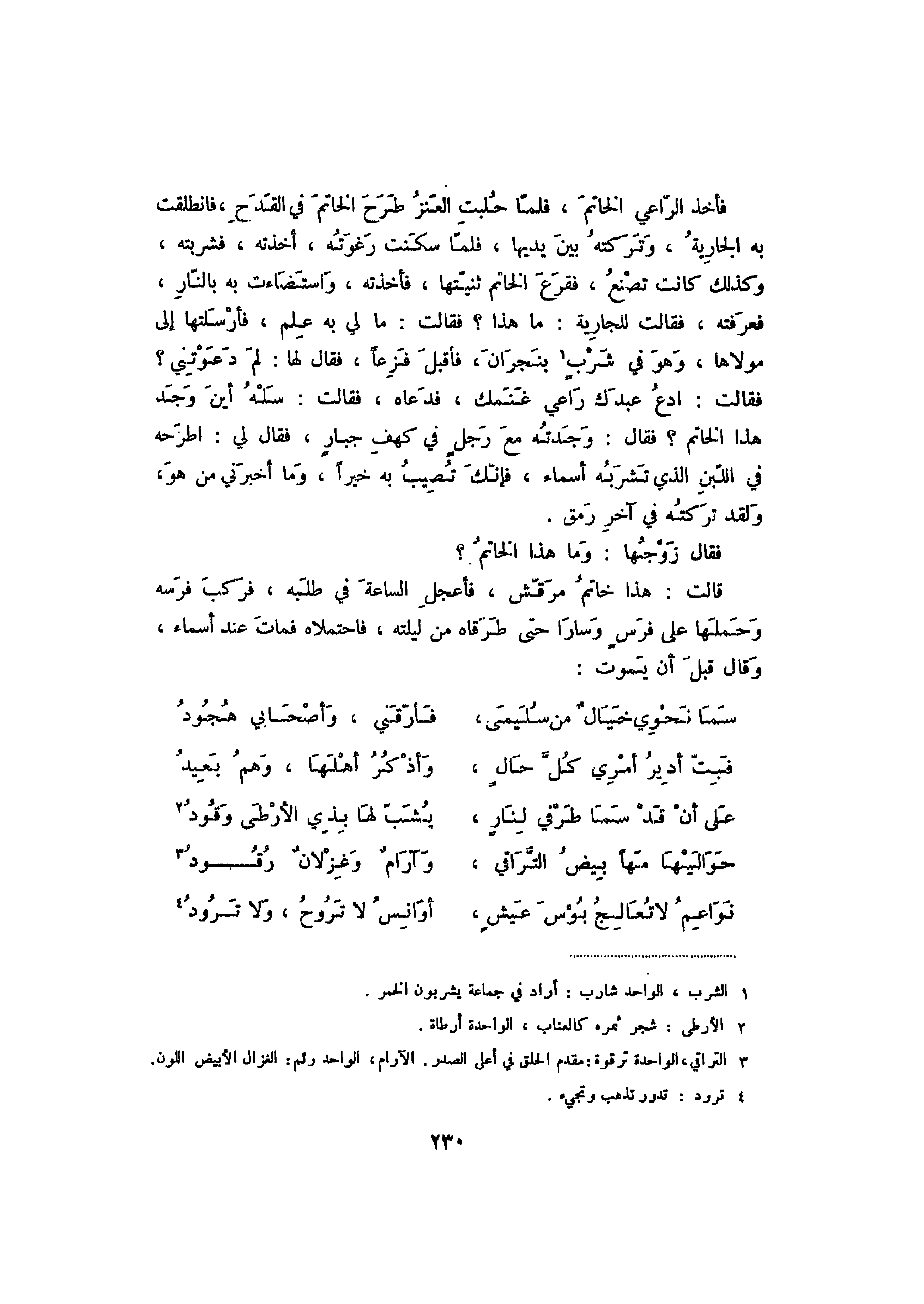 فأخذ الراعي الخاتم، فلما حلبت العنز طرح الخاتم في القدح، فانطلقت به الجارية، وتركته بين يديها، فلما سكنت رغوته، اخذته، فشربته، وكذلك كانت تصنع، فقرع الخاتم ثنيتها، فأخذته، واستضاءت به بالنار، فعرفته، فقالت للجارية: ما هذا؟ فقالت: ما لي به علم، فأرسلتها إلى مولاها، وهو في شربٍ بنجران، فأقبل فزعاً، فقال لها: لم دعوتني؟ فقالت: ادع عبدك راعي غنمك، فدعاه، فقالت: سله أين وجد هذا الخاتم؟ فقال: وجدته مع رجل في كهفي جبارٍ، فقاللي: اطرحه في اللبن الذي تشربه أسماء، فإنك تصيب به خيراً، وما أخبرني من هو، ولقد تركته في آخر رمق.