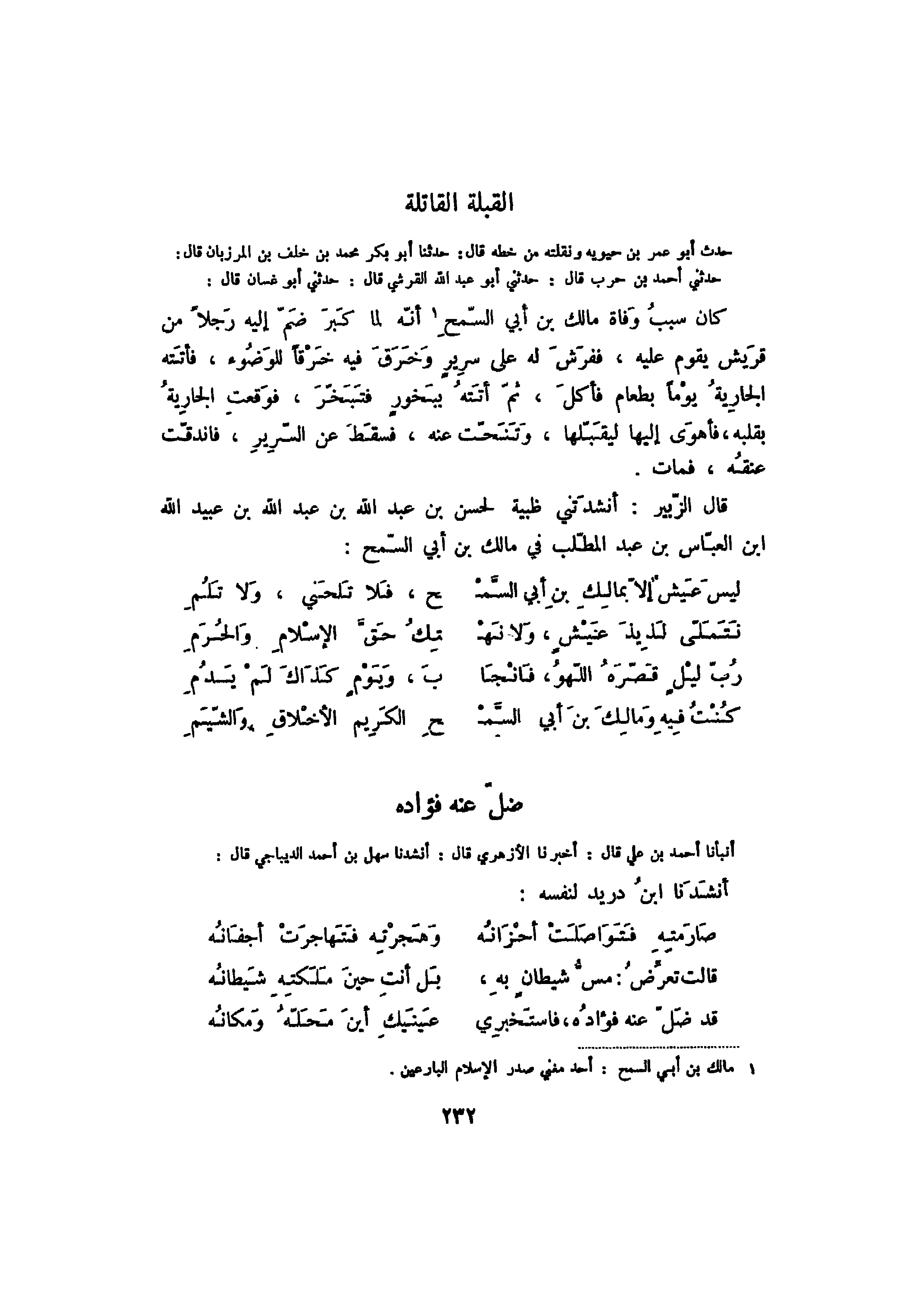 قال الزبير: أنشدتني ظبية لحسن بن عبد الله بن عبد الله بن عبد الله بن العابس بن عبد المطلب في مالك بن أبي السمح: