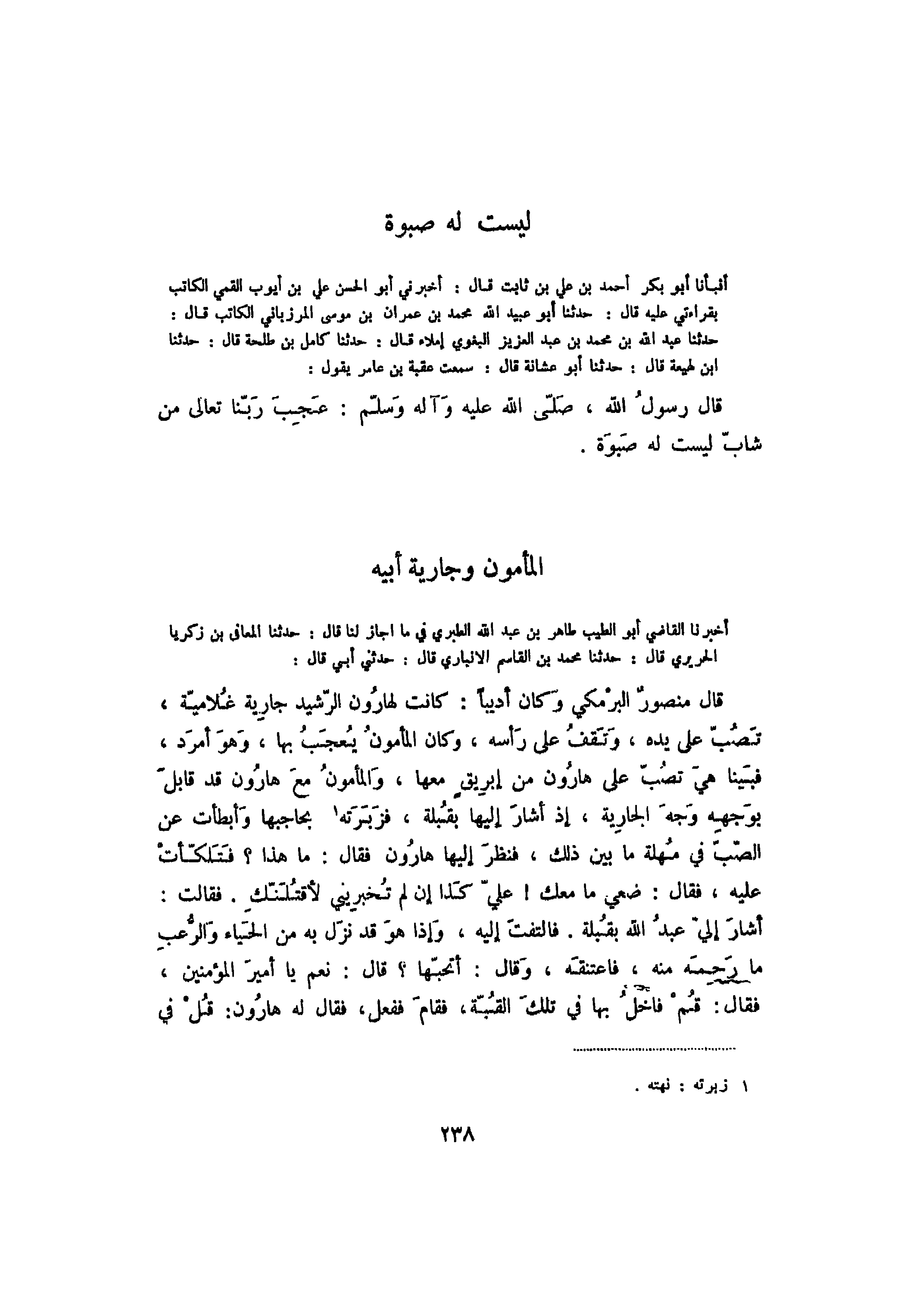 أخبرنا القاضي أبو الطيب طاهر بن عبد الله الطبري في ما أجاز لنا قال: حدثنا المعافى بن زكريا الحريري قال: حدثنا محمد بن القاسم الأنباري قال: حدثني أبي قال: قال منصور البرمكي وكان أديباً: كانت لهارون الرشيد جارية غلامية، تصب على يده، وتقف على رأسه، وكان المأمون يعجب بها، وهو أمرد، فبينا هي تصب على هارون من إبريق معها، والمأمون مع هارون قد قابل بوجهه وجه الجارية، إذ أشار إليها بقبلة، فزبرته، بحاجبها وأبطأت عن الصب في مهلة ما بين ذلك، فنظر إليها هارون فقال: ما هذا؟ فتلكأت عليه، فقال: ضعي ما معك! علي كذا إن لم تخبريني لأقتلنك. فقالت: أشار إلي عبد الله بقبلة. فالتفت إليه، وإذا هو قد نزل به من الحياء والرعب ما رحمه منه، فاعتنقه، وقال: أتحبها؟ قال: نعم يا أمير المؤمنين، فقال: قم فاخل بها في تلك القبة، فقام فعل، فقال له هارون: قل في