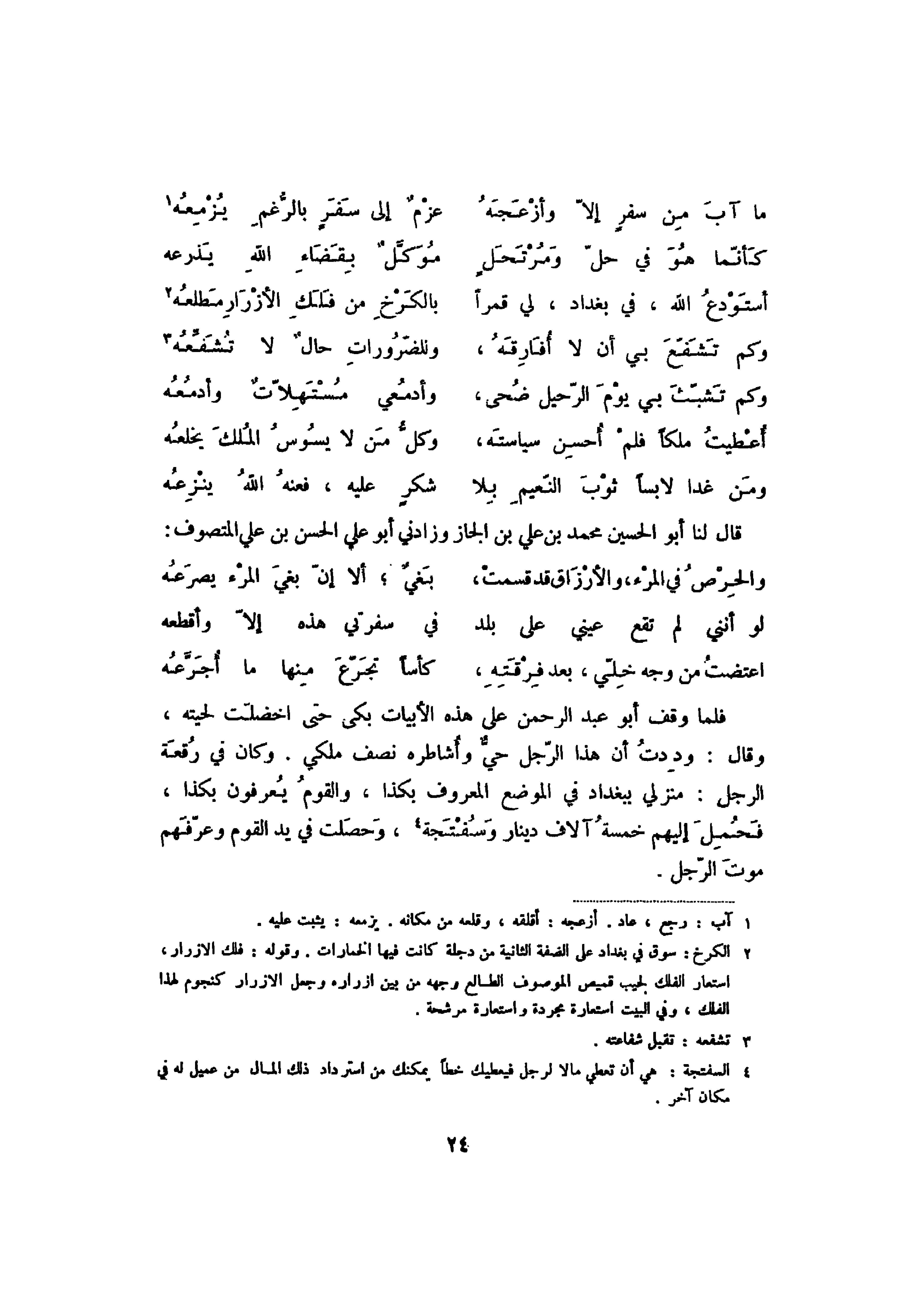 فلما وقف أبو عبد الرحمن على هذه الأبيات بكى حتى اخضلت لحيته، وقال: وددت أن هذا الرجل حي وأشاطره نصف ملكي. وكان في رقعة الرجل: منزلي ببغداد في الموضع المعروف بكذا، والقوم يعرفون بكذا، فحمل إليهم خمسة آلاف دينار وسفتجة، وحصلت في يد القوم وعرفهم موت الرجل.