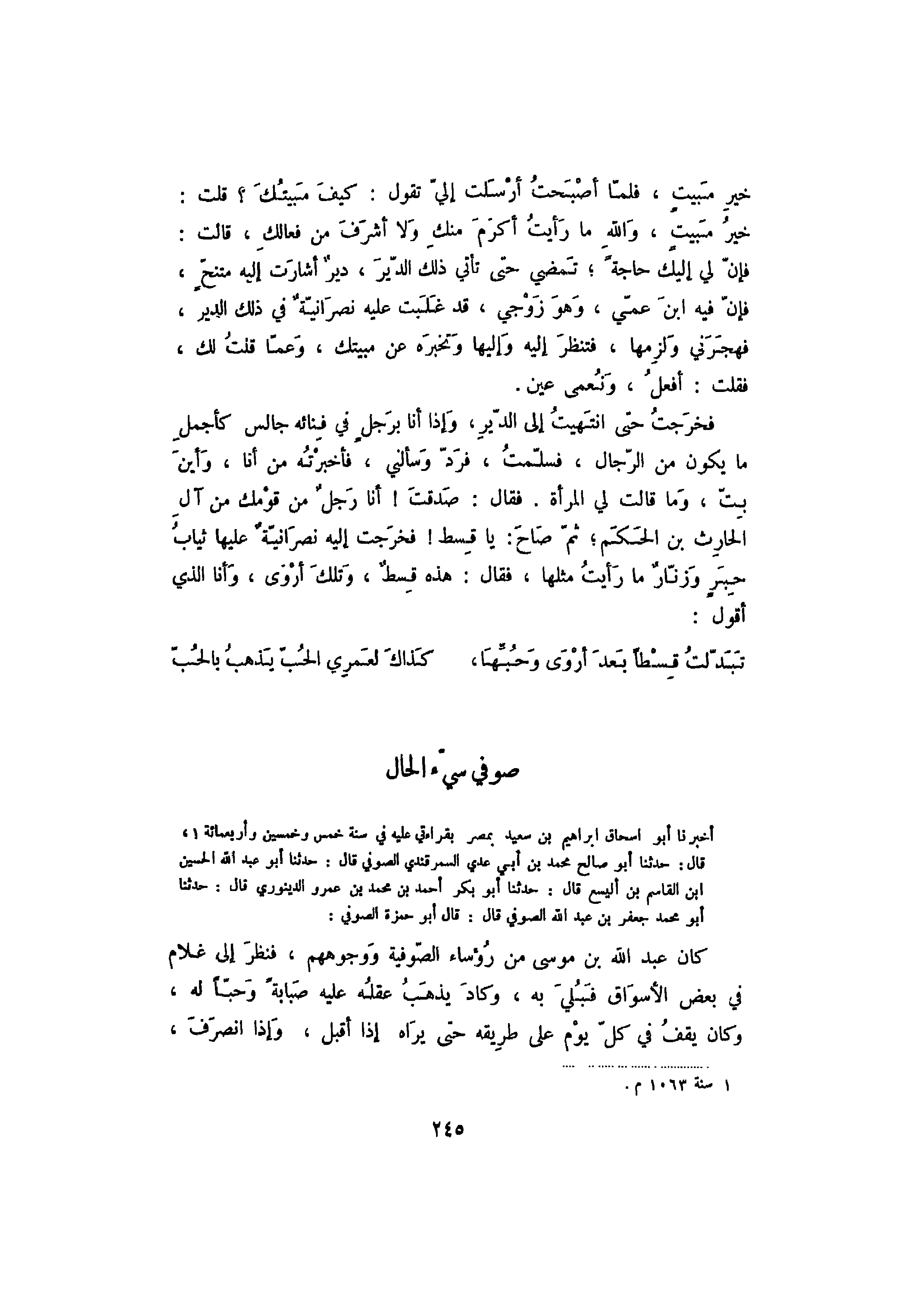 أخبرنا أبو إسحاق إبراهيم بن سعيد بمصر بقراءتي عليه في سنة خمس وخمسين وأربعمائة، قال: حدثنا أبو صالح محمد بن أبي عدي السمرقندي الصوفي قال: حدثنا أبو عبد الله الحسين بن القاسم بن أليسع قال: حدثنا أبو بكر أحمد بن محمد بن عمرو الدينوري قال: حدثنا أبو محمد جعفر بن عبد الله الصوفي قال: قال أبو حمزة الصوفي: كان عبد الله بن موسى من رؤساء الصوفية ووجوههم، فنظر إلى غلام في بعض الأسواق فبلي به، وكاد يذهب عقله عليه صبابةً وحباً له، وكان يقف في كل يوم على طريقه حتى يراه إذا أقبل، وإذا انصرف،