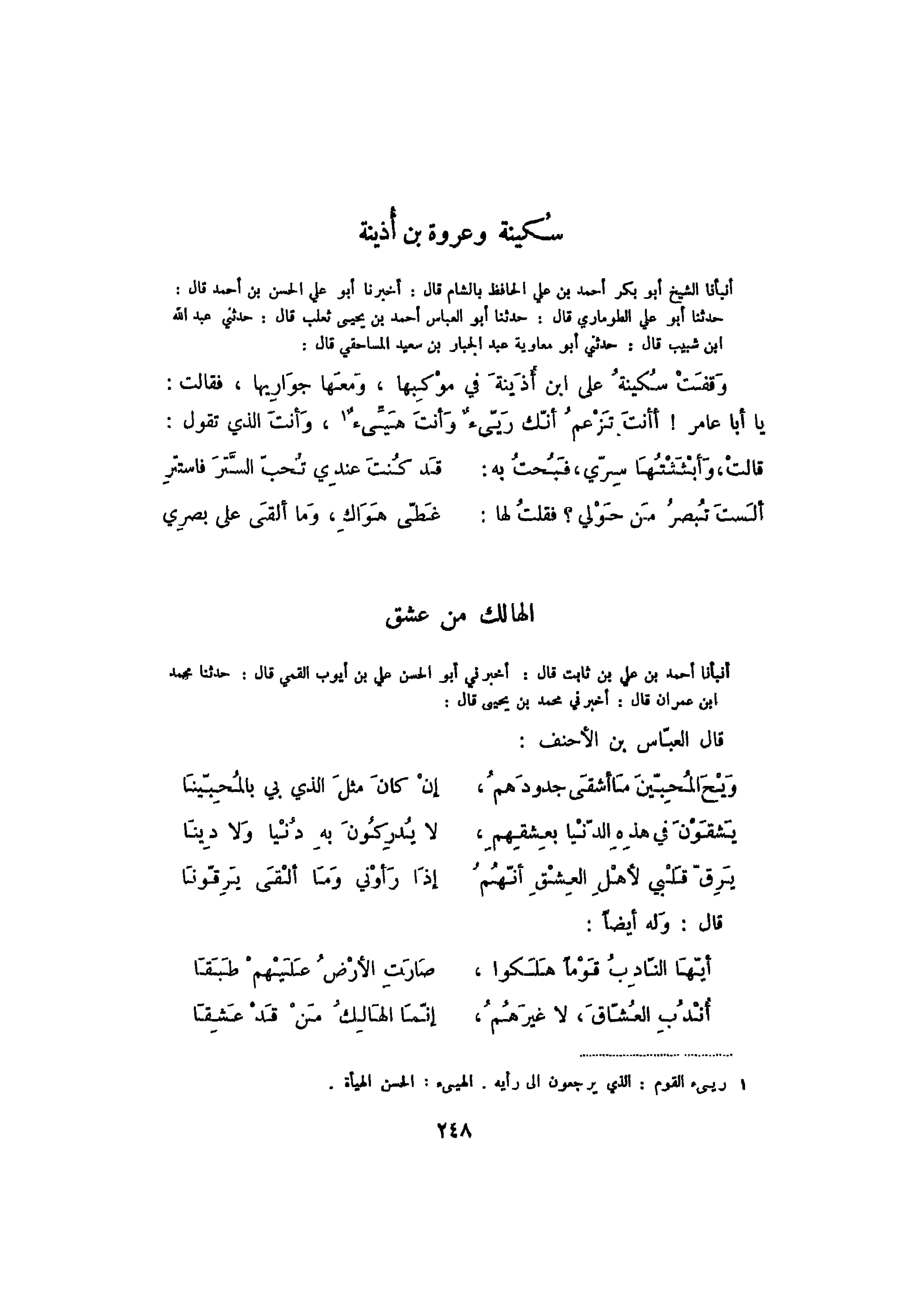 أنبأنا أحمد علي بن ثابت قال: أخبرني أبو الحسن علي بن أيوب القمي قال: حدثنا محمد بن عمران قال: أخبرني محمد بن يحيى قال: قال العباس بن الأحنف:
