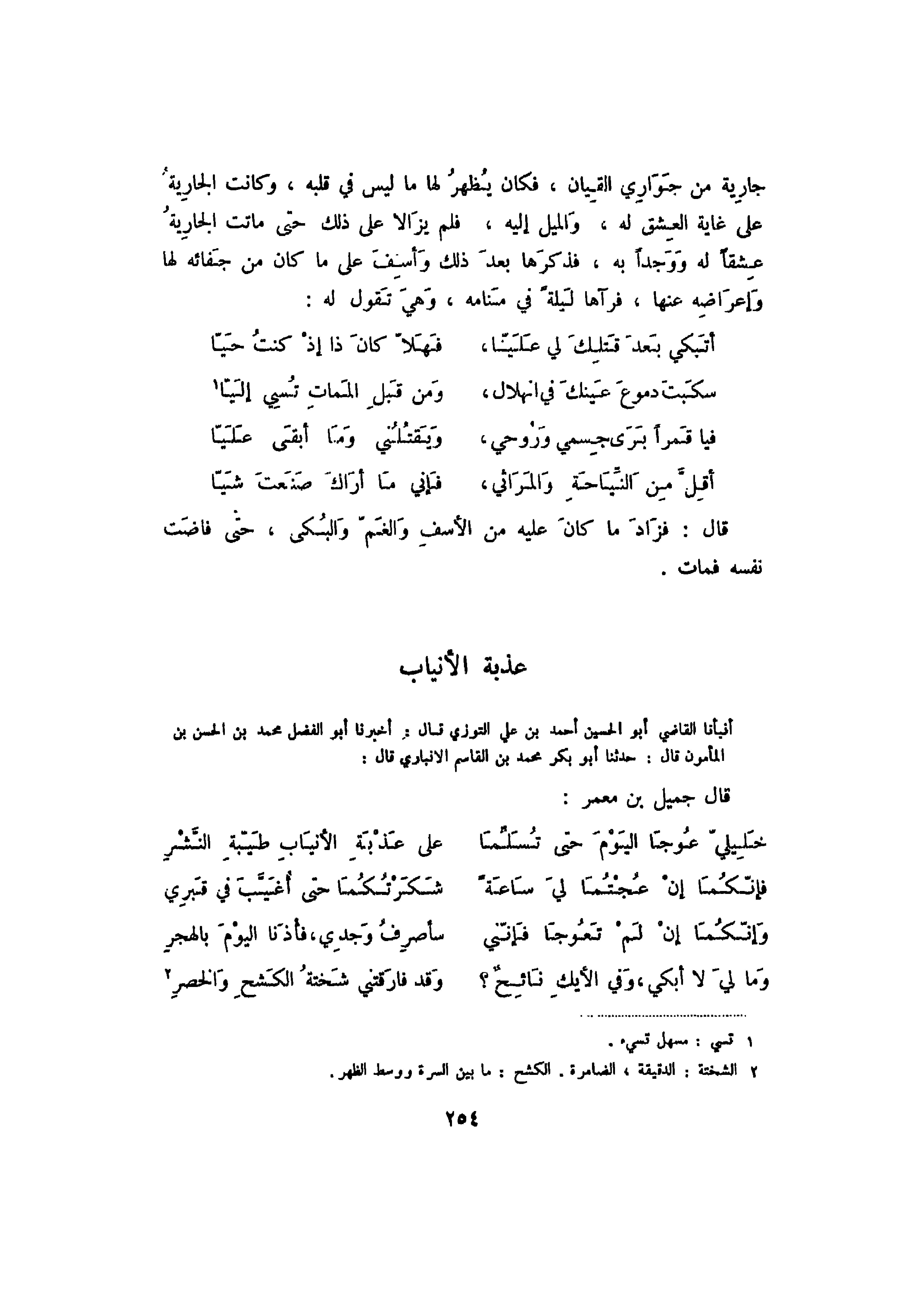 أنبأنا القاضي أبو الحسين أحمد بن علي التوزي قال: أخبرنا أبو الفضل محمد بن الحسن بن المأمون قال: حدثنا أبو بكر محمد بن القاسم الأنباري قال: قال جميل بن معمر: