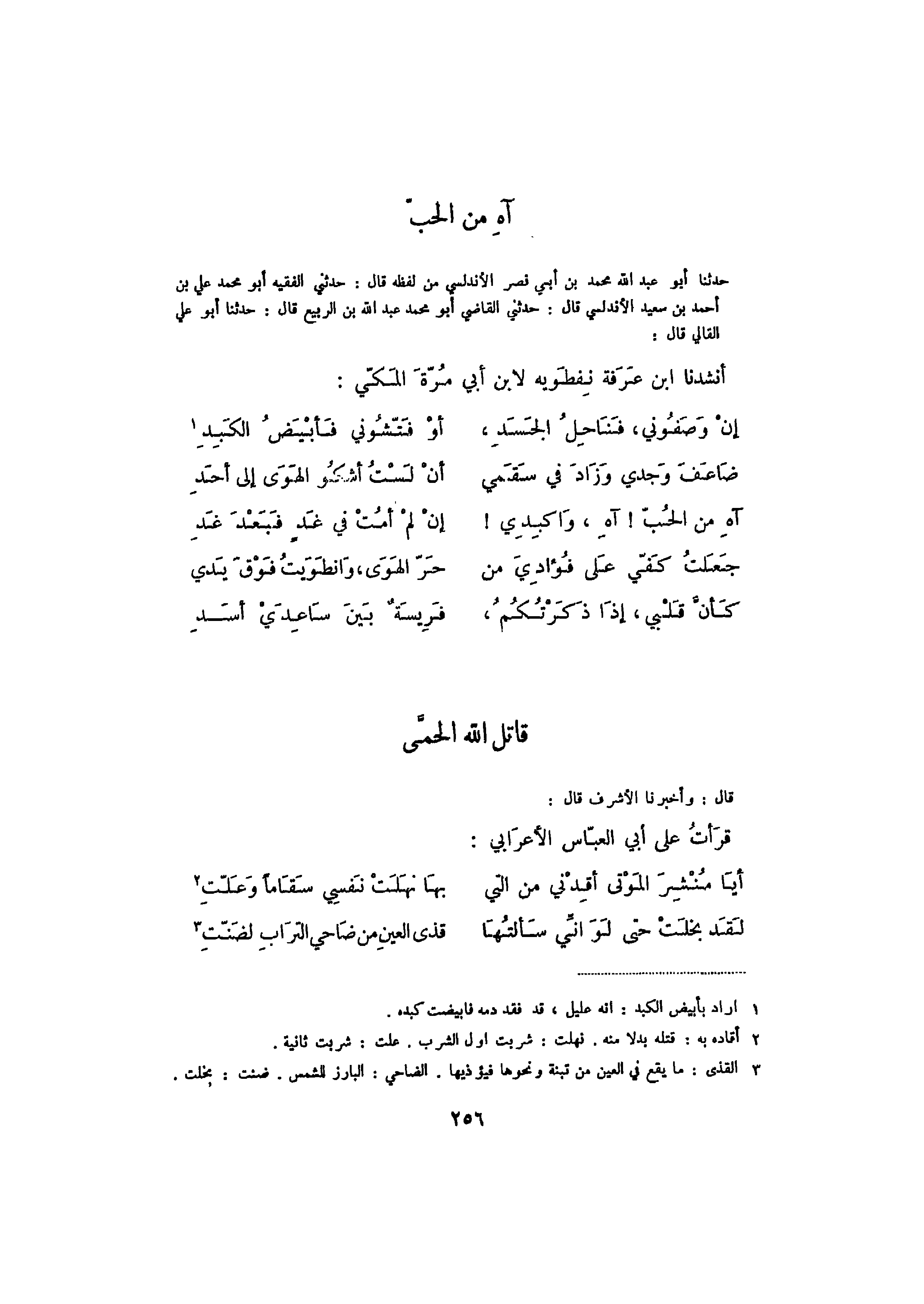 حدثنا أبو عبد الله بن أبي نصر الأندلس من لفظه قال: حدثني الفقيه أبو محمد علي بن أحمد بن سعيد الأندلسي قال: حدثني القاضي أبو محمد عبد الله بن الربيع قال: حدثنا أبو علي القالي قال: أنشدنا ابن عرفة نفطويه لابن أبي مرة المكي: