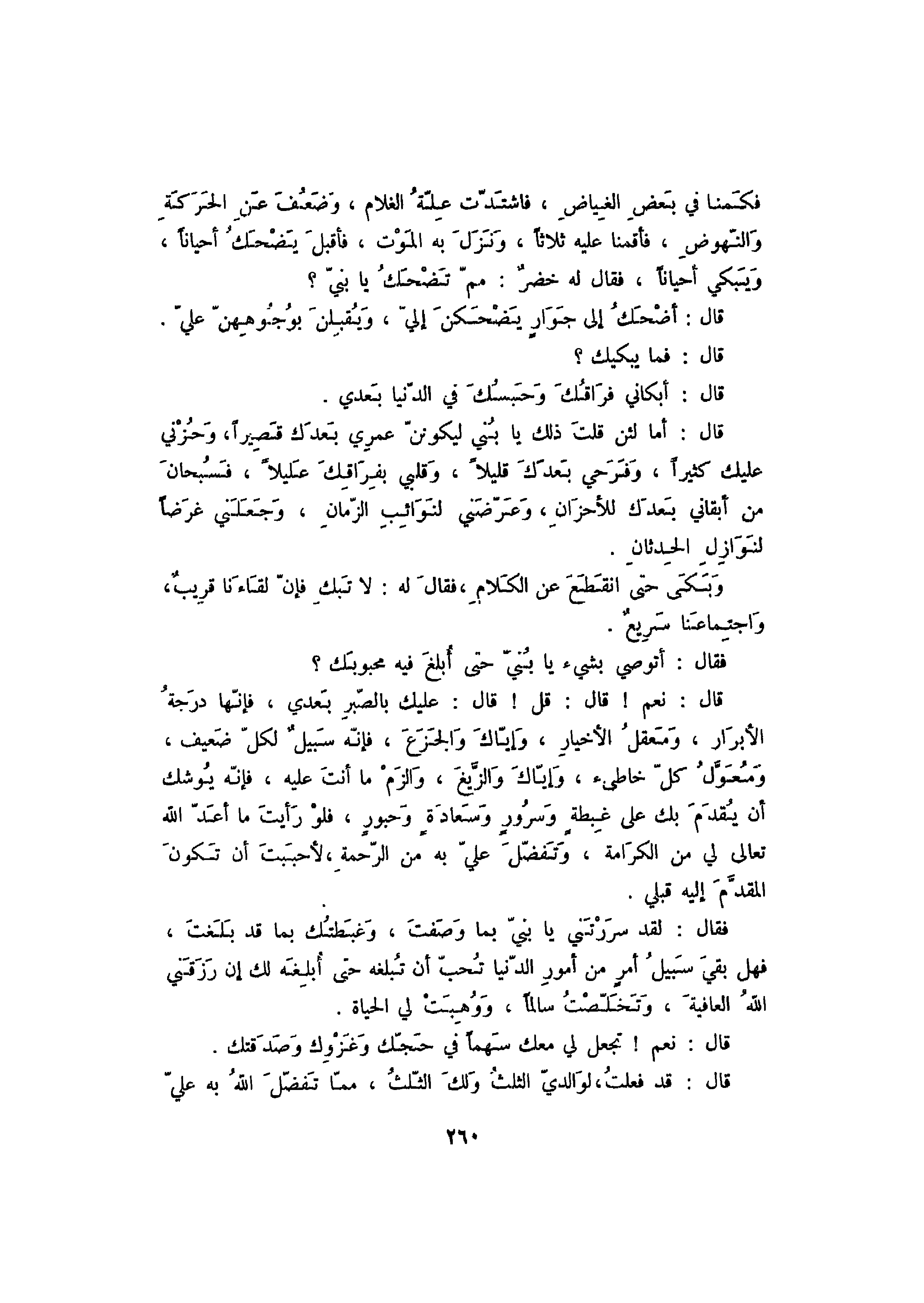 قال: أما لئن قلت ذلك يا بني ليكونن عمري بعدك قصيراً، وحزني عليك كثيراً، وفرحي بعدك قليلاً، وقلبي بفراقك عليلاً، فسبحان من أبقاني بعدك للأحزان، وعرضني لنوائب الزمان، وجعلني غرضاً لنوازل الحدثان.