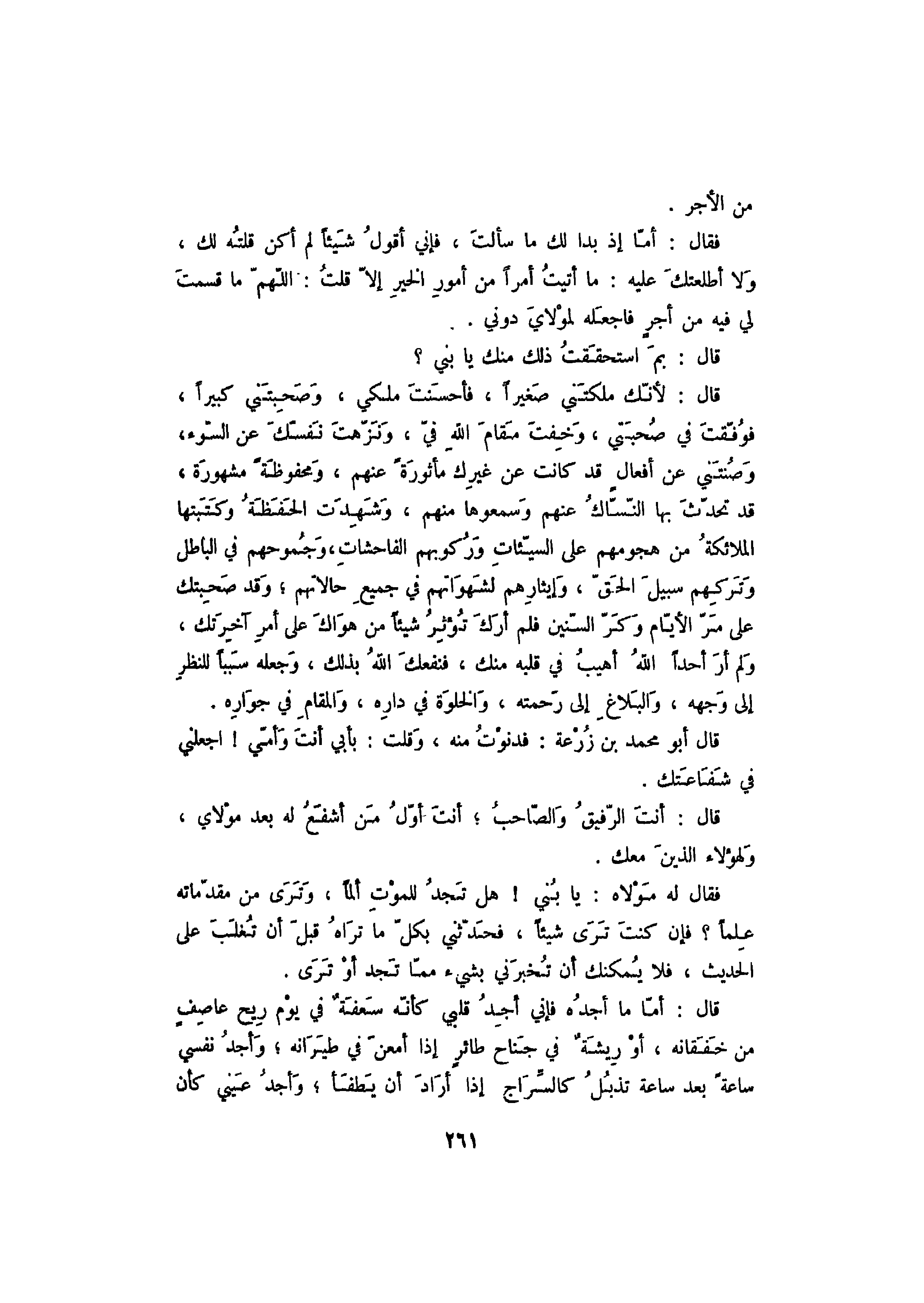 فقال: أما إذ بدا لك ما سألت، فإني أقول لم أكن قلته لك، ولا أطلعتك عليه: ما أتيت أمراً من أمور الخير إلا قلت: اللهم ما قسمت لي فيه من أجر فاجعله لمولاي دوني.