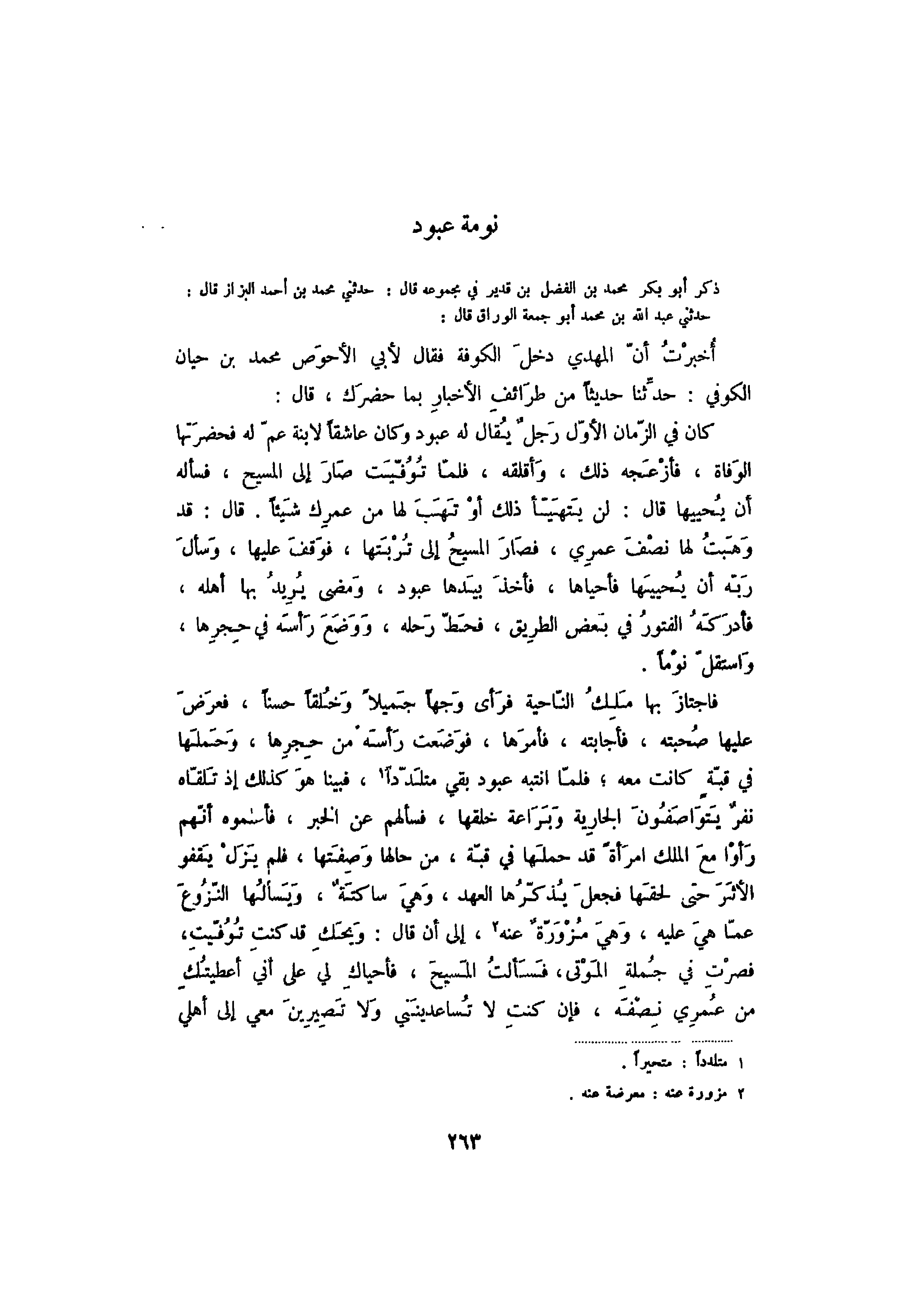 ذكر أبو بكر محمد بن الفضل بن قدير في مجموعة قال: حدثني محمد بن أحمد البزاز قال: حدثني عبد الله بن محمد أبو جمعة الوراق قال: أخبرت أن المهدي دخل الكوفة فقال لأبي الأحوص محمدبن حيان الكوفي: حدثنا حديثاً من طرائف الأخبار بما حضرك، قال: كان في الزامن الأول رجل يقال له عبود وكان عاشقاً لابنة عم له فحضرتها الوفاة، فأزعجه ذلك، وأقلقه، فلما توفيت صار إلى المسيح، فسأله أن يحييها قال: لن يتهيأ ذلك أو تهب لها من عمرك شيئاً. قال: قد وهبت لها نصف عمري، فصار المسيح إلى تربتها، فوقف عليها، وسأل ربه أن يحييها فأحياها، فأخذ بيدها عبود، ومضى يريد بها أله، فأدركه الفتور في بعض الطريف، فحط رحله، ووضع رأسه في حجرها، واستقل نوماً.