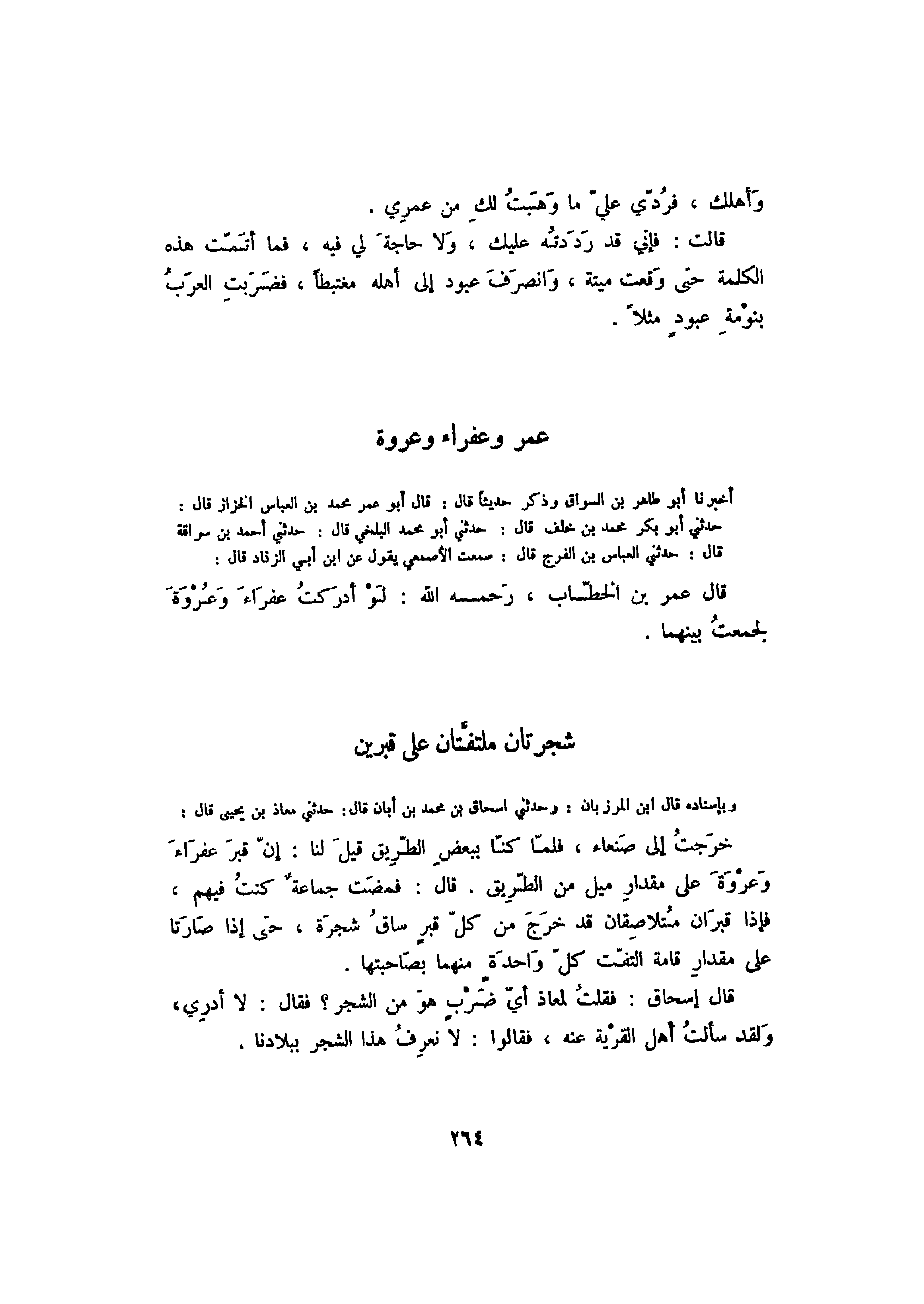 وبإسناده قال ابن المرزبان: وحدثني إسحاق بن محمد بن أبان قال: حدثني معاذ بن يحيى قال: خرجت إلى صنعاء، فلما كنا ببعض الطريق قيل لنا: إن قبر عفراء وعروة على مقدار ميل من الطريق. قال: فمضت جماعة كنت فيهم، فإذا قبران متلاصقان قد خرج من كل قبر ساق شجرة، حتى إذا صارتا على مقدار قامة التفت كل واحدة منهام بصاحبتها.