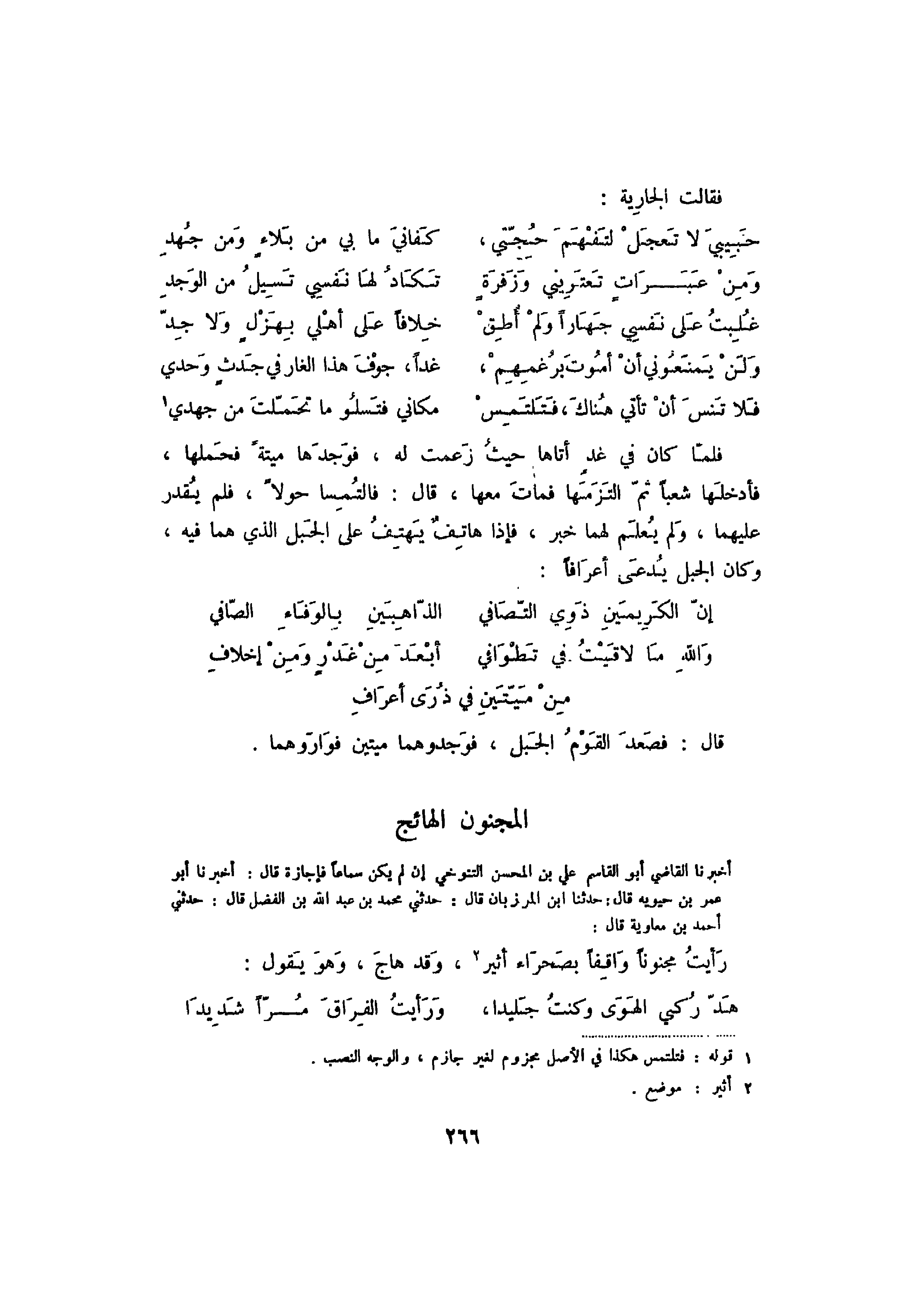 أخبرنا القاضي أبو القاسم علي بن المحسن التنوخي إن لم يكن سماعاً فإجازة قال: اخبرنا أبو عمر بن حيويه قال: حدثنا ابن المرزبان قال: حدثني محمد بن عبد الله بن الفضل قال: حدثني أحمد بن معاوية قال: رأيت مجنوناً بصحراء أثير، وقد هاج، وهو يقول:
