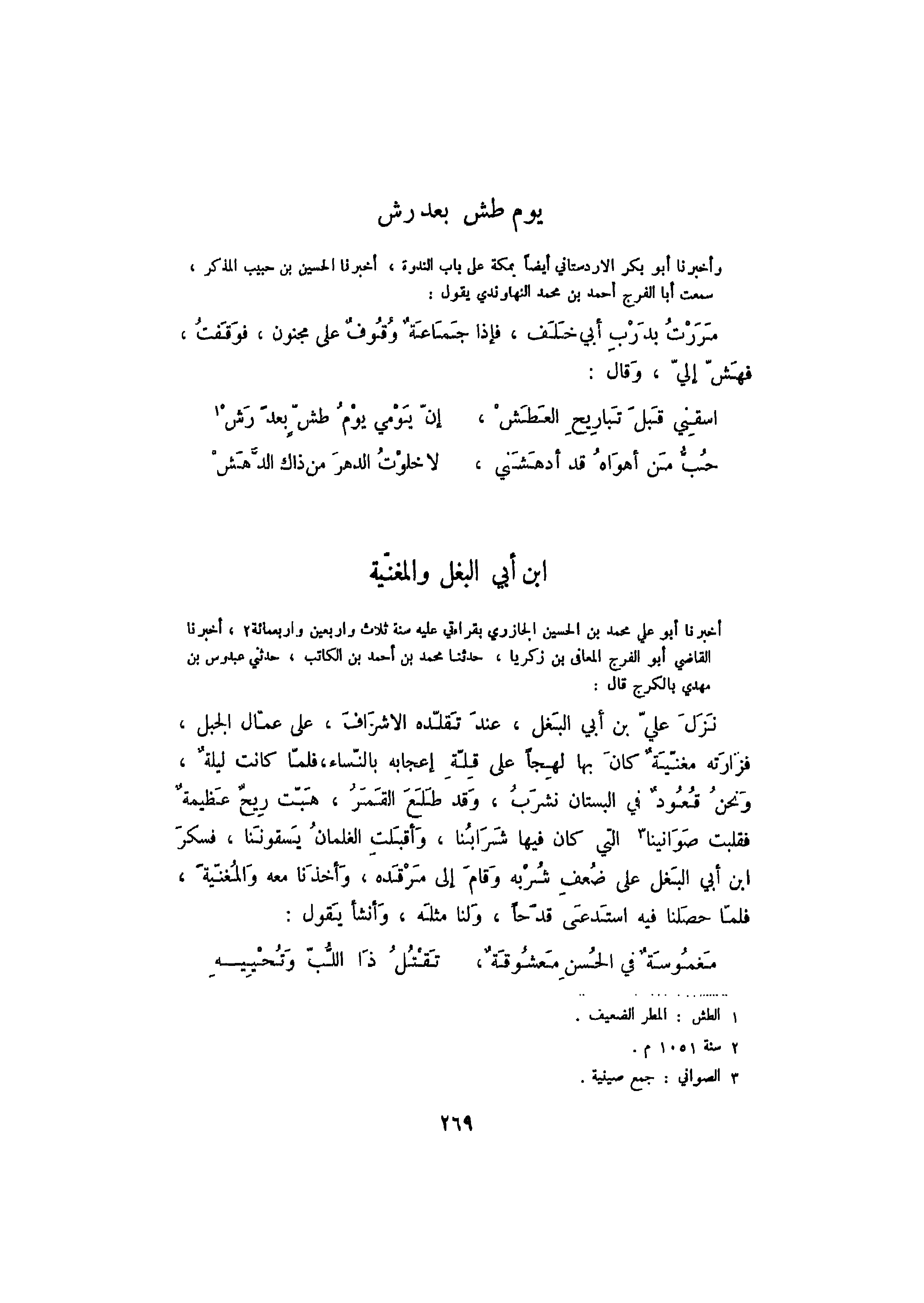 وأخبرنا أبو بكر الأردستاني أيضاً بمكة على باب الندوة، أخبرنا الحسين بن حبيب المذكر، سمعت أبا الفرج أحمد بن محمد النهاوندي يقول: مررت بدرب أبي خلفن فإذا جماعة وقوف على مجنون، فوقفت فهش إلي، وقال: