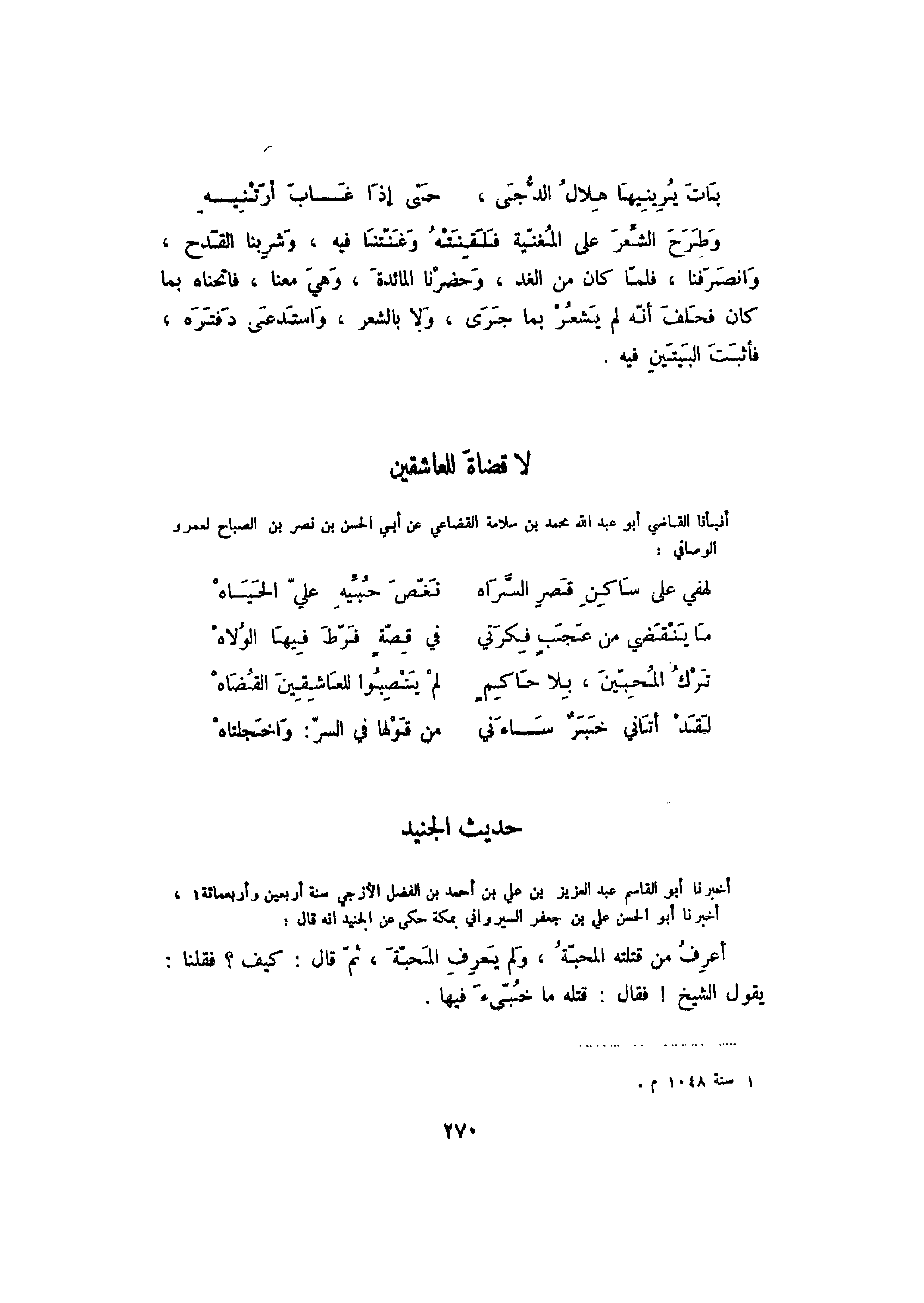 أخبرنا أبو القاسم عبد العزيز بن علي بن أحمد بن الفضل الأزجي سنة أربعين وأربعمائة، أخبرنا أبو الحسن علي بن جعفر السيرواني بمكة حكى عن الجنيد أنه قال: أعرف من قتلته المحبة، ولم يعرف المحبة، ثم قال: كيف؟ فقلنا: يقول الشيخ! فقال: قتله ما خبئ فيها.