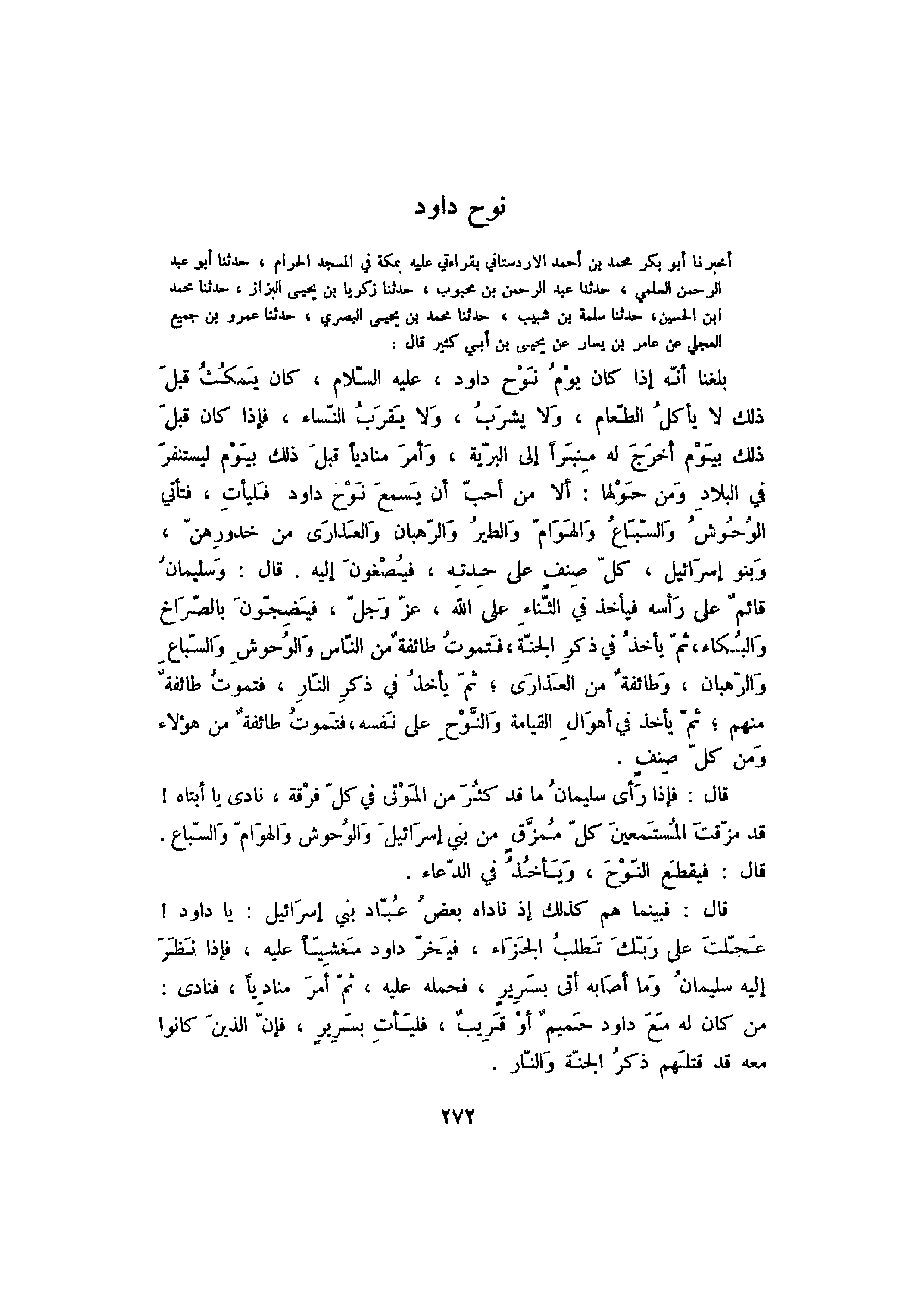 أخبرنا أبو بكر محمد بن أحمد الأردستاني بقراءتي عليه بمكة في المسجد الحرام، حدثنا أبو عبد الرحمن السلمي، حدثنا عبد الرحمن بن محبوب، حدثنا زكريا بن يحيى البزاز، حدثنا محمد بن الحسين، حدثنا سلمة بن شبيب، حدثنا محمد بن يحيى البصري، حدثنا عمرو بن جميع العجلي عن عامر بن يسار عن يحيى بن أبي كثير قال: بلغنا أنه إذا كان يوم نوح داود، عليه السلام، كان يمكث قبل ذلك لا يأكل الطعام، ولا يشرب، ولا يقرب النساء، فإذا كان قبل ذلك بيوم أخرج له منبراً إلى البرية، وأمر منادياً قبل ذلك بيوم ليستنفر في البلاد ومن حولها: ألا من أحب أن يسمع نوح داود فليأت، فتأتي الوحوش والسباع والهوام والطير والرهبان والعذارى من خدورهن، وبنو إسرائيل، كل صنف على حدته، فيصغون إليه. قال: وسليمان قائم على رأسه فيأخذ في الثناء على الله، عز وجل، فيضجون بالصراخ والبكاء، ثم يأخذ في ذكر الجنة، فتموت طائفة من الناس والوحوش والسباع والرهبان، وطائفة من العذارى، ثم يأخذ في ذكر النار، فتموت طائفة منهم، ثم يأخذ في أهوال القيامة والنوح على نفسه، فتموت طائفة من هؤلاء ومن كل صنف.