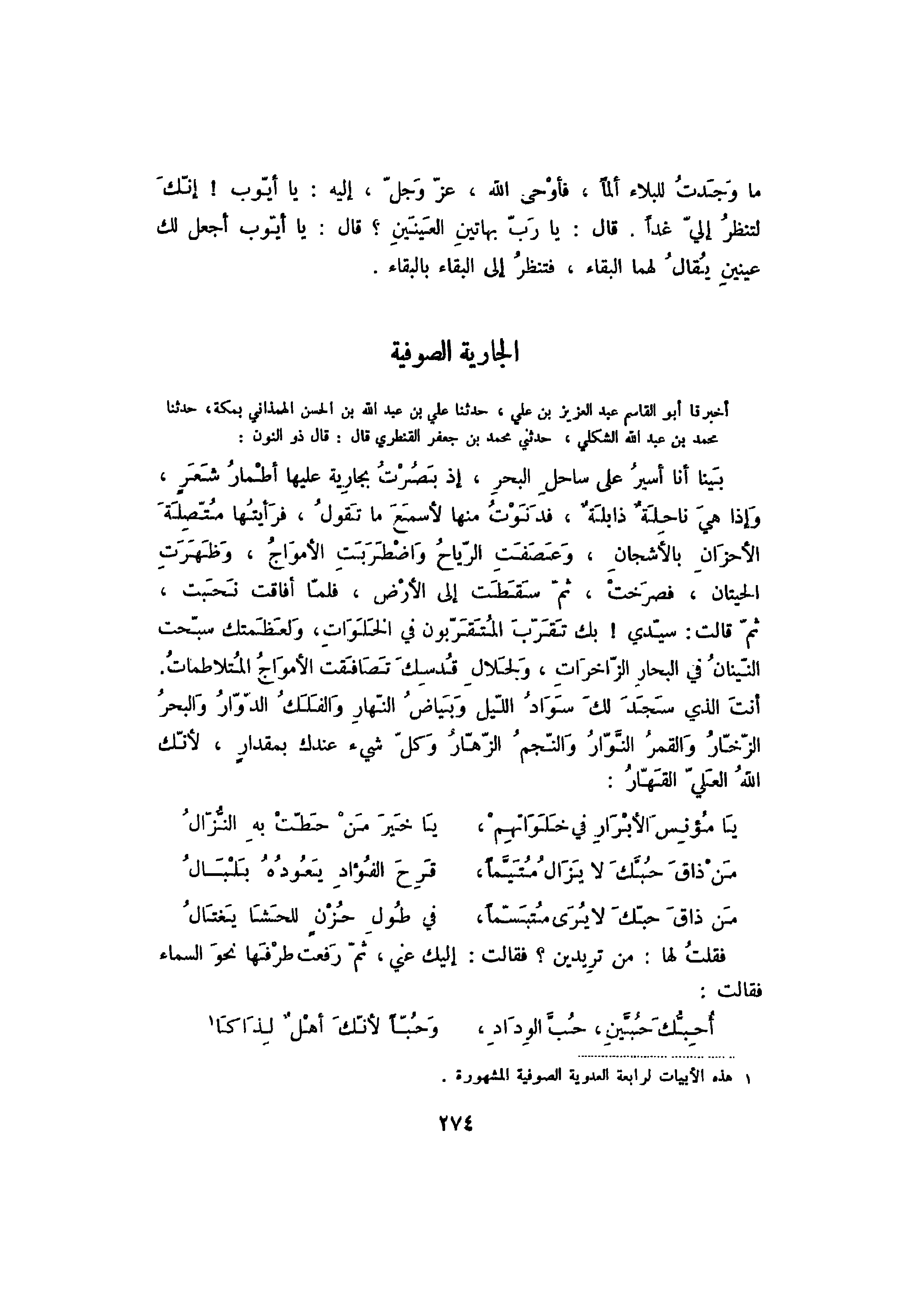 أخبرنا أبو القاسم عبد العزيز بن علي، حدثنا علي بن عبد الله بن الحسن الهمذاني بمكة، حدثنا محمد بن عبد الله الشكلي، حدثني محمد بن القنطري قال: قال ذو النون: بينا أنا أسير على ساحل البحر، إذ بصرت بجارية عليها أطمار شعرٍ، وإذا هي ناحلة ذابلة، فدنوت منها لأسمع ما تقول، فرأيتها متصلة الأحزان بالأشجان، وعصفت الرياح واضطربت الأمواج، وظهرت الحيتان، فصرخت، ثم سقطت إلى الأرض، فلما أفاقت نحبت، ثم قالت: سيدي! بك تقرب المتقربون في الخلوات، ولعظمتك سبحت النينان في البحار الزاخرات، ولجلال قدسك تضافقت الامواج المتلاطمات. أنت الذي سجد لك سواد الليل وبياض النهار والفلك الدوار والبحر الزخار والقمر النوار والنجم الزهار وكل شيء عندك بمقدار، لأنك الله العلي القهار:
