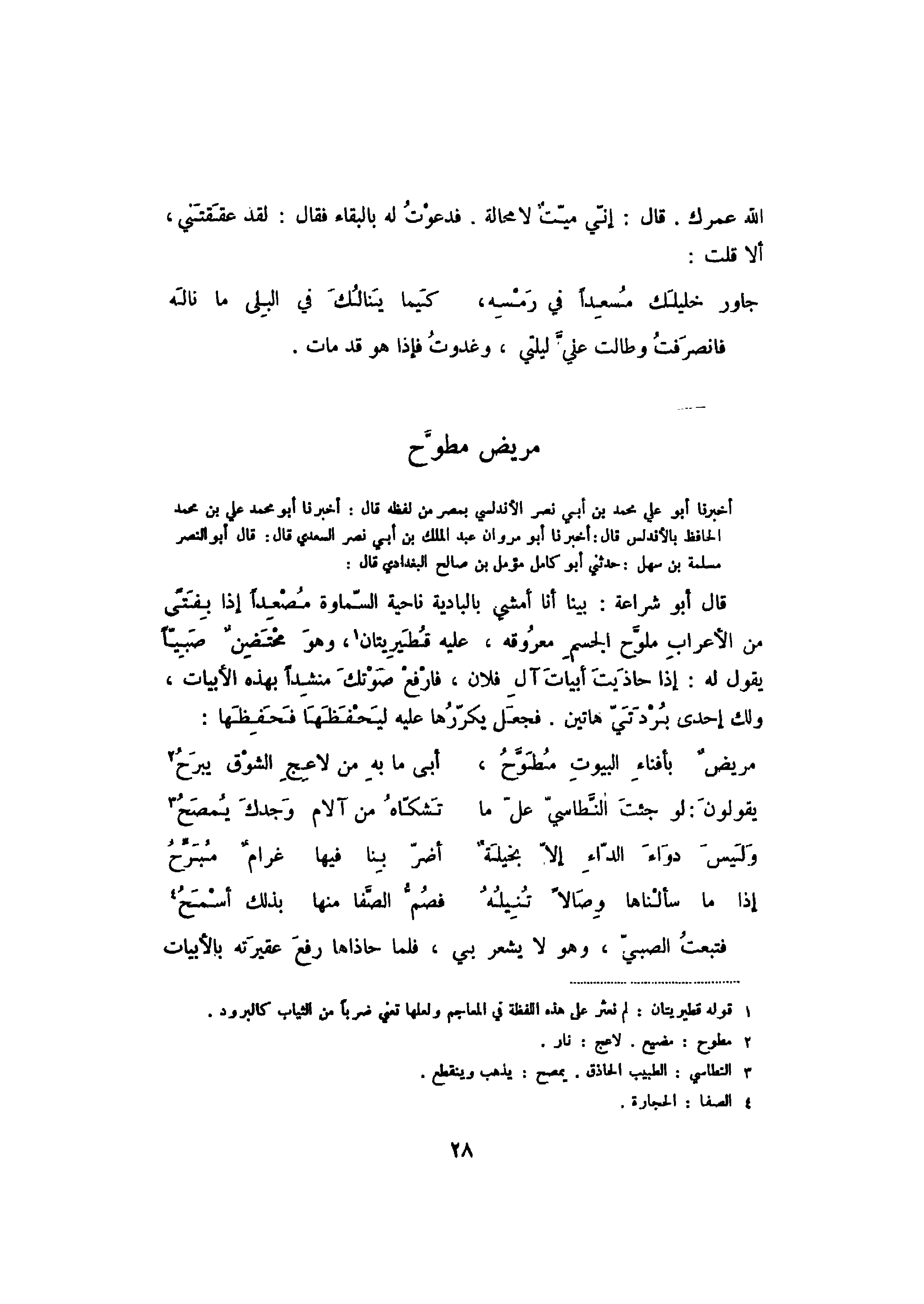 مريضٌ بأفناءِ البيوتِ مُطَوَّحُ، ... أبى ما بهِ من لاعِجِ الشوْق يبرَحُ.