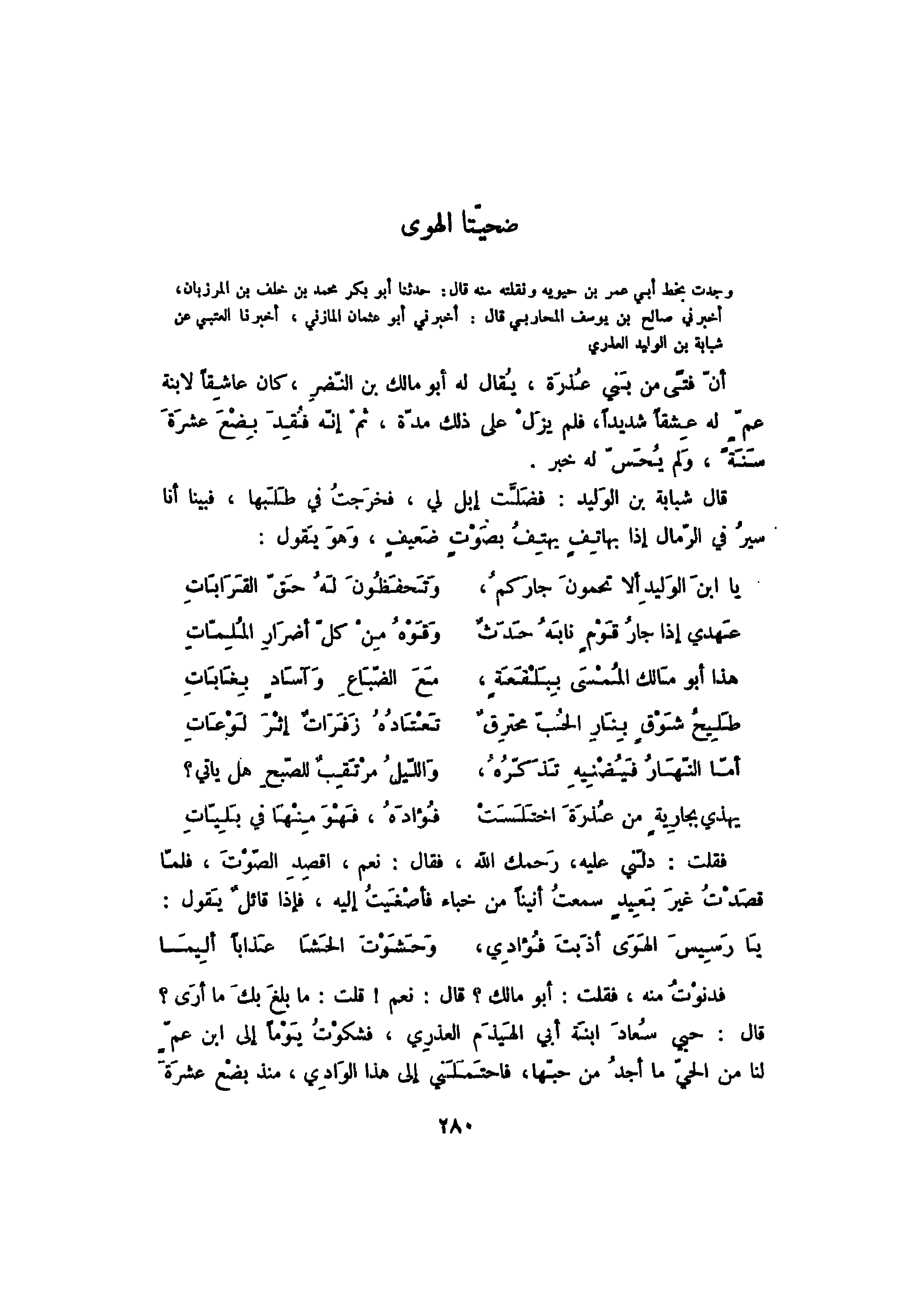 وجدت بخط أبي عمر بن حيويه ونقلته منه قال: حدثنا أبو بكر محمد بن خلف بن المرزبان، أخبرني صالح بن يوسف المحاربي قال: أخبرني أبو عثمان المازني، أخبرنا العتبي عن شبابة بن الوليد العذري أن فتىً من بني عذرة، يقال له أبو مالك بن النضر، كان عاشقاً لابنة عم له عشقاً شديداً، فلم يزل على ذلك مدة، ثم إنه فقد بضع عشرة سنة، ولم يحس له خبر.
