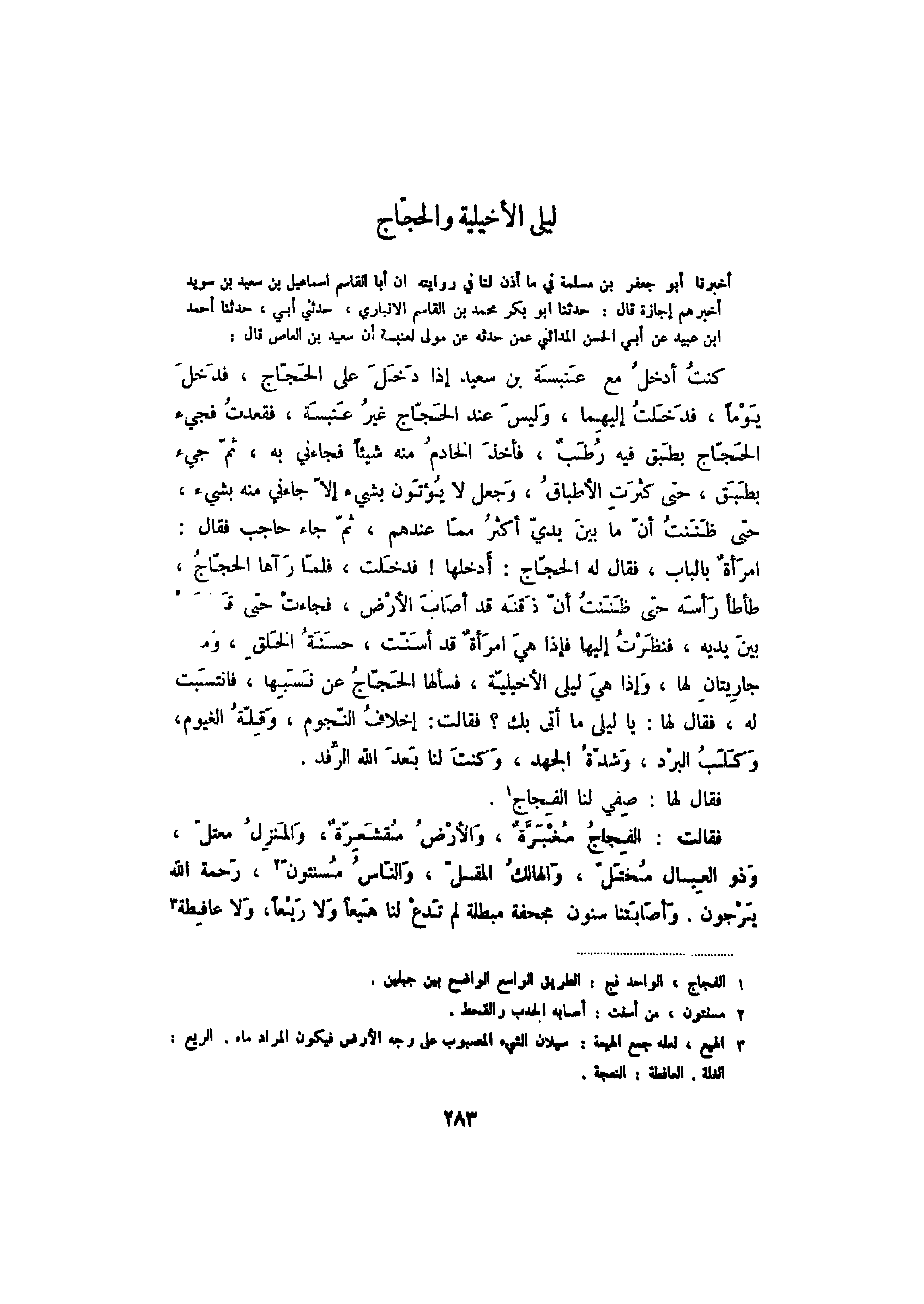 أخبرنا أبو جعفر بن مسلمة في ما أذن لنا في روايته أن أبا القاسم إسماعيل بن سعيد بن سويد أخبرهم إجازة قال: حدثنا أبو بكر محمد بن القاسم الأنباري، حدثني أبي، حدثنا أحمد بن عبيد عن أبي الحسن المدائني عمن حدثه عن مولى لعنبسة أن سعيد بن العاص قال: كنت أدخل مع عنبسة بن سعيد إذا دخل على الحجاج، فدخل يوماً، فدخلت إليهما، وليس عند الحجاج غير عنبسة، فقعدت فجيء الحجاج بطبق فيه رطب، فأخذ الخادم منه شيئاً فجاءني به، ثم جيء بطبق، حتى كثرت الأطباقن وجعل لا يؤتون بشيء إلا جاءني منه بشيء، جتى ظننت أن ما بين يدي أكثر مما عندهم، ثم جاء حاجب فقال: امرأة بالباب، فقال له الحجاج: أدخلها! فدخلت، فلما رآها الحجاج، طأطأ رأسه حتى ظننت أن ذقنه قد اصاب الأرض، فجاءت حتى بين يديه، فنظرت إليها فإذا هي امرأة قد أسنت، حسنة الخلق، ومعها جاريتان لها، وإذا هي ليلى الأخيلية، فسألها الحجاج عن نسبها، فانتسبت له، فقال لها: يا ليلى ما أتىبك؟ فقالت: إخلاف النجوم، وقلة الغيوم، وكلب البرد، وشدة الجهد، وكنت لنا بعد الله الرفد.
