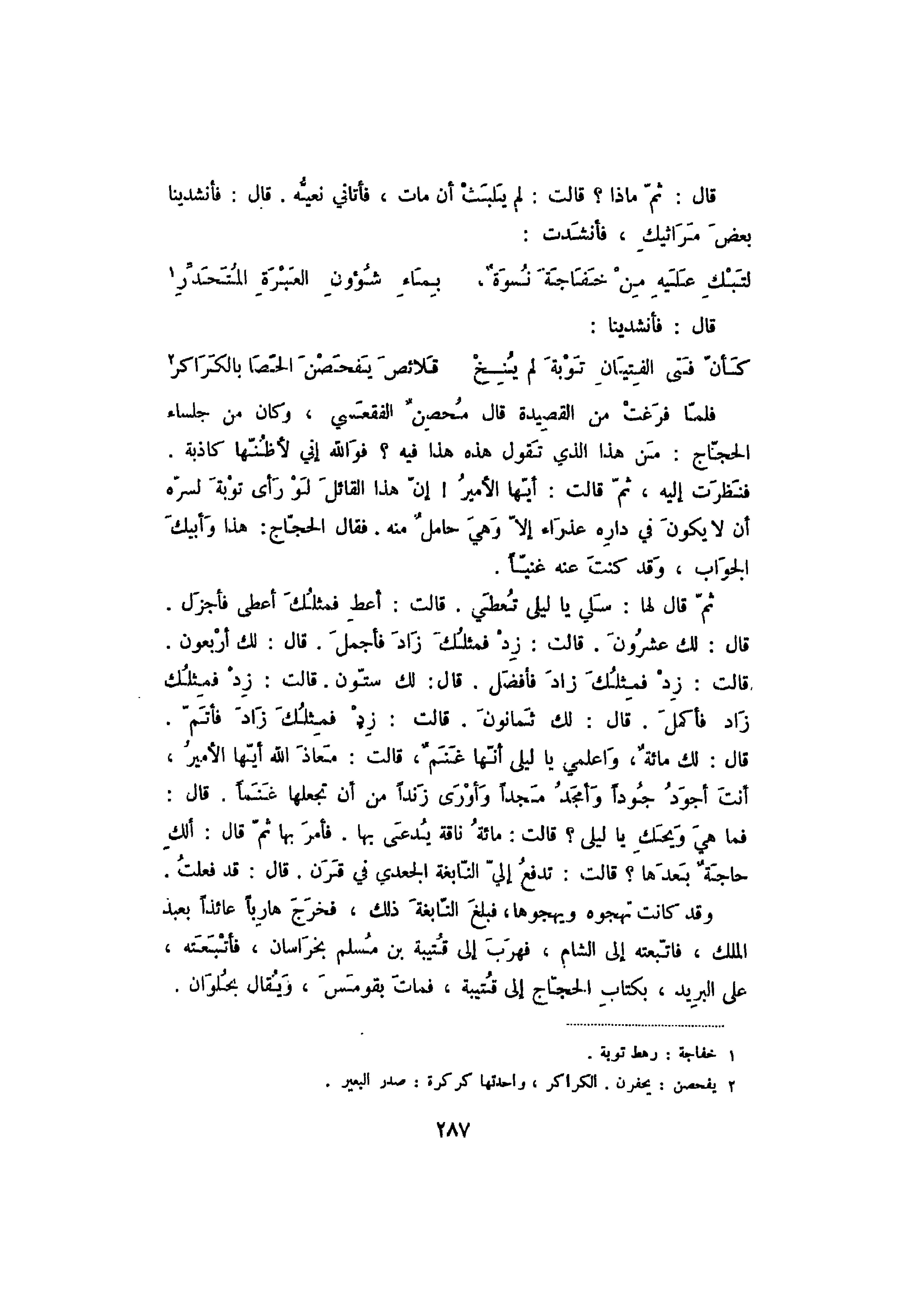 قال: لك عشرون. قالت: زد فمثلك زاد فأجمل. قال: لك أربعون. قالت: زد فمثلك زاد فأفضل. قال: لك ستون. قالت: زد فمثلك زاد فأكمل. قال: لك ثمانون. قالت: زد فمثلك زاد فأتم. قال: لك مائة، واعلمي يا ليلى أنها غنم، قال: معاذ الله أيها الأمير، أنت أجود جواداً وأمجد مجداً وأورى زنداً من أن تجعلها غنماً. قال: فما هي ويحك يا ليلى؟ قالت: مائة ناقة يدعى بها. فأمر بها ثم قال: ألك حاجةٌ بعدها؟ قالت: تدفع إلي النابغة الجعدي في قرن. قال: قد فعلت.