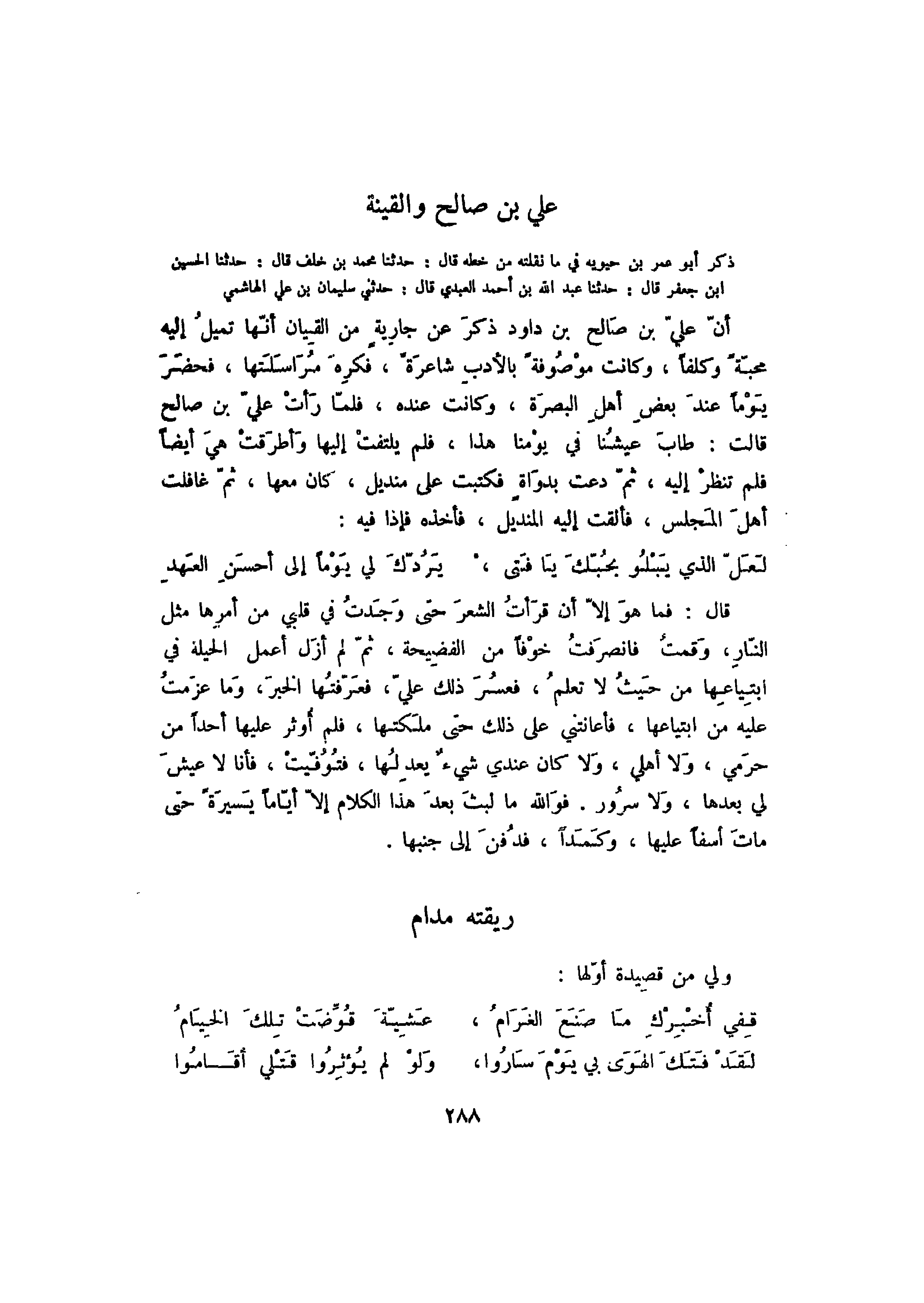 ذكر أبو عمر بن حيويه في ما نقلته من خطه قال: حدثنا محمد بن خلف قال: حدثنا الحسين بن جعفر قال: حدثنا عبد الله بن أحمد العبدي قال: حدثني سليمان بن علي الهاشمي أن علي بن صالح بن داود ذكر عن جارية من القيان أنها تميل إليه محبةً وكلفاً، وكانت موصوفةً بالأدب شاعرةً، فكره مراسلتها، فحضر يوماً عند بعض أهل البصرة، وكانت عنده، فلما رأت علي بن صالح قالت: طاب عيشنا في يومنا هذا، فلم يلتفت إليها وأطرقت هي أيضاً فلم تنظر إليه، ثم دعت بداوة فكتبت على منديل، كان معها، ثم غافلت أهل المجلس، فألقت إليه المنديل، فأخذه فإذا فيه: