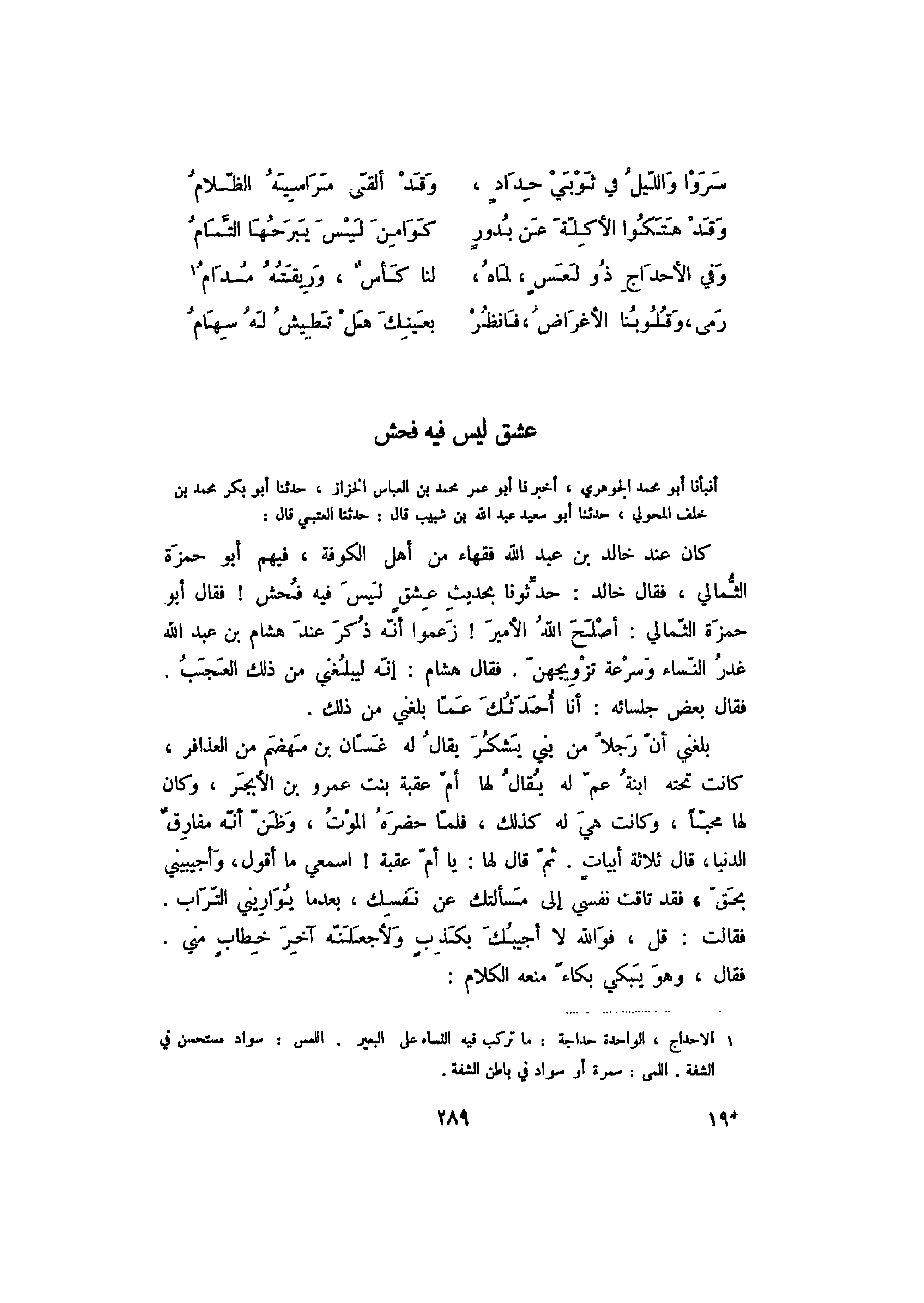 أنبأنا أبو محمد الجوهري، أخبرنا أبو عمر محمد بن العباس الخزاز، حدثنا أبو بكر محمد بن خلف المحولي، حدثنا أبو سعيد عبد الله بن شبيب قال: حدثنا العتبي قال: كان عند خالد بن عبد الله فقهاء من أهل الكوفة، فيهم أبو حمزة الثمالي، فقال خالد: حدثونا بحديث عشق ليس فيه فحش! فقال أبو حمزة الثمالي: أصلح الله الأمير! زعموا أنه ذكر عند هشام بن عبد الله غدر النساء وسرعة تزويجهن. فقال هشام: إنه ليبلغني من ذلك العجب.
