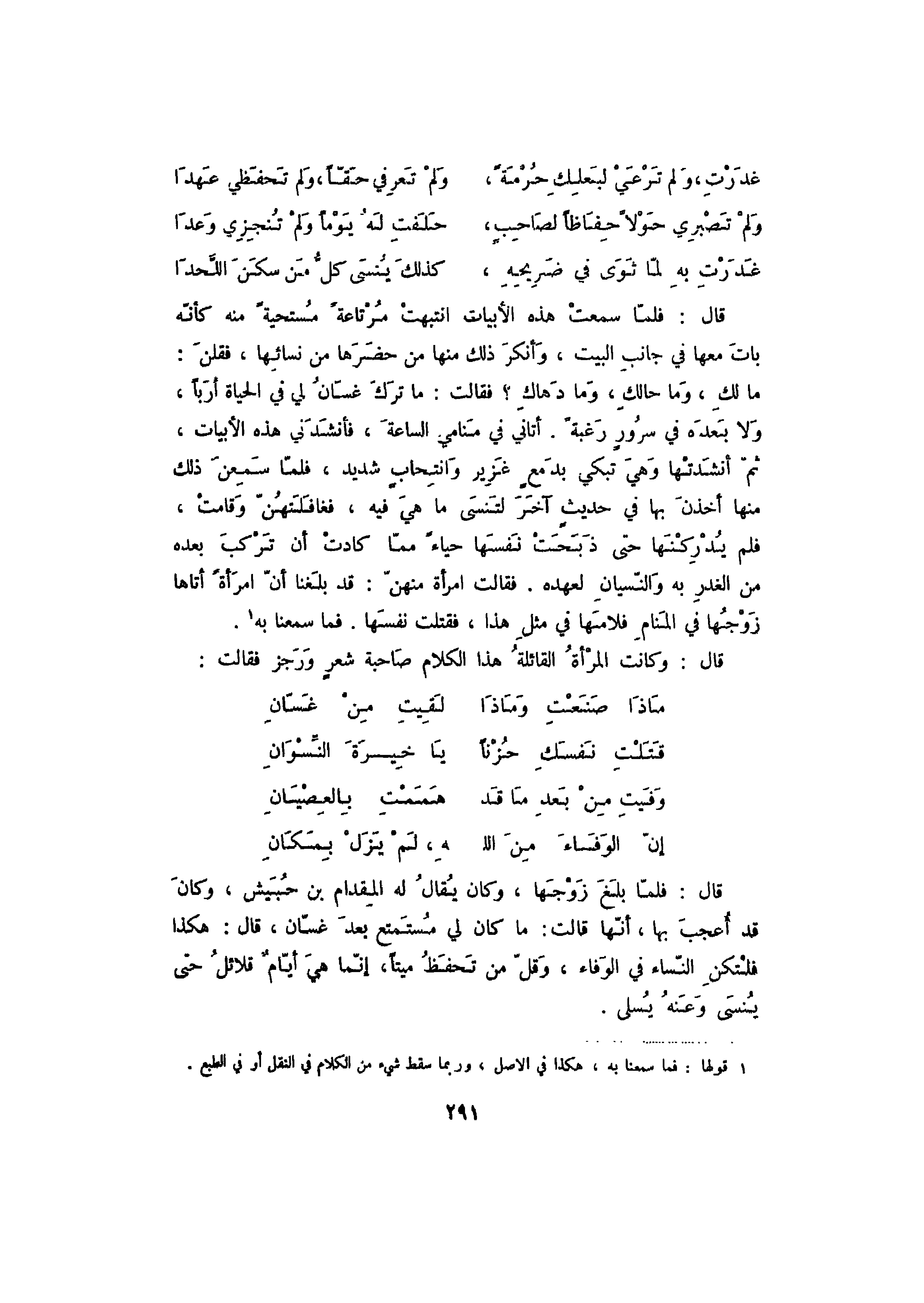 قال: فلما بلغ زوجها، وكان يقال له المقدام بن حبيش، وكان قد أعجب بها، أنها قالت: ما كان لي مستمتع بعد غسان، قال: هكذا فلتكن النساء في الوفاء، وقل من تحفظ ميتاً، إنما هي أيام قلائل حتى ينسى وعنه يسلى.