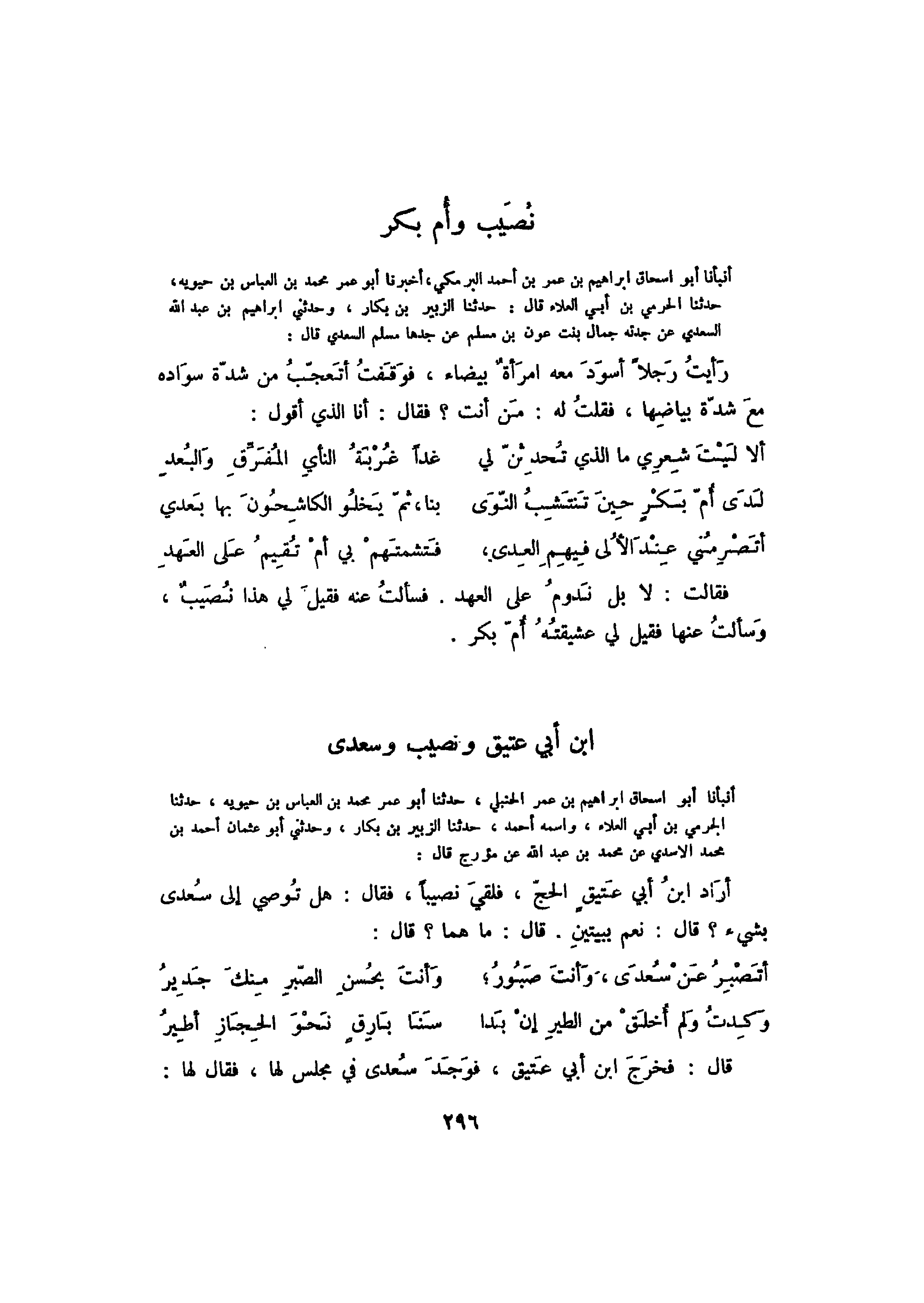 أنبأنا أبو إسحاق إبراهيم بن عمر الحنبلي، حدثنا أبو عمر محمد بن العباس بن حيويه، حدثنا الجرمي بن أبي العلاء، واسمه أحمد، حدثنا الزبير بن بكار، وحدثني أبو عثمان أحمد بن محمد الأسدي عن محمد بن عبد الله عن مؤرخ قال: أراد ابن أبي عتيقٍ الحج، فلقي نصيباً، فقال: هل توصي إلى سعدى بشيء؟ قال: نعم ببيتين. قال: ما هما؟ قال: