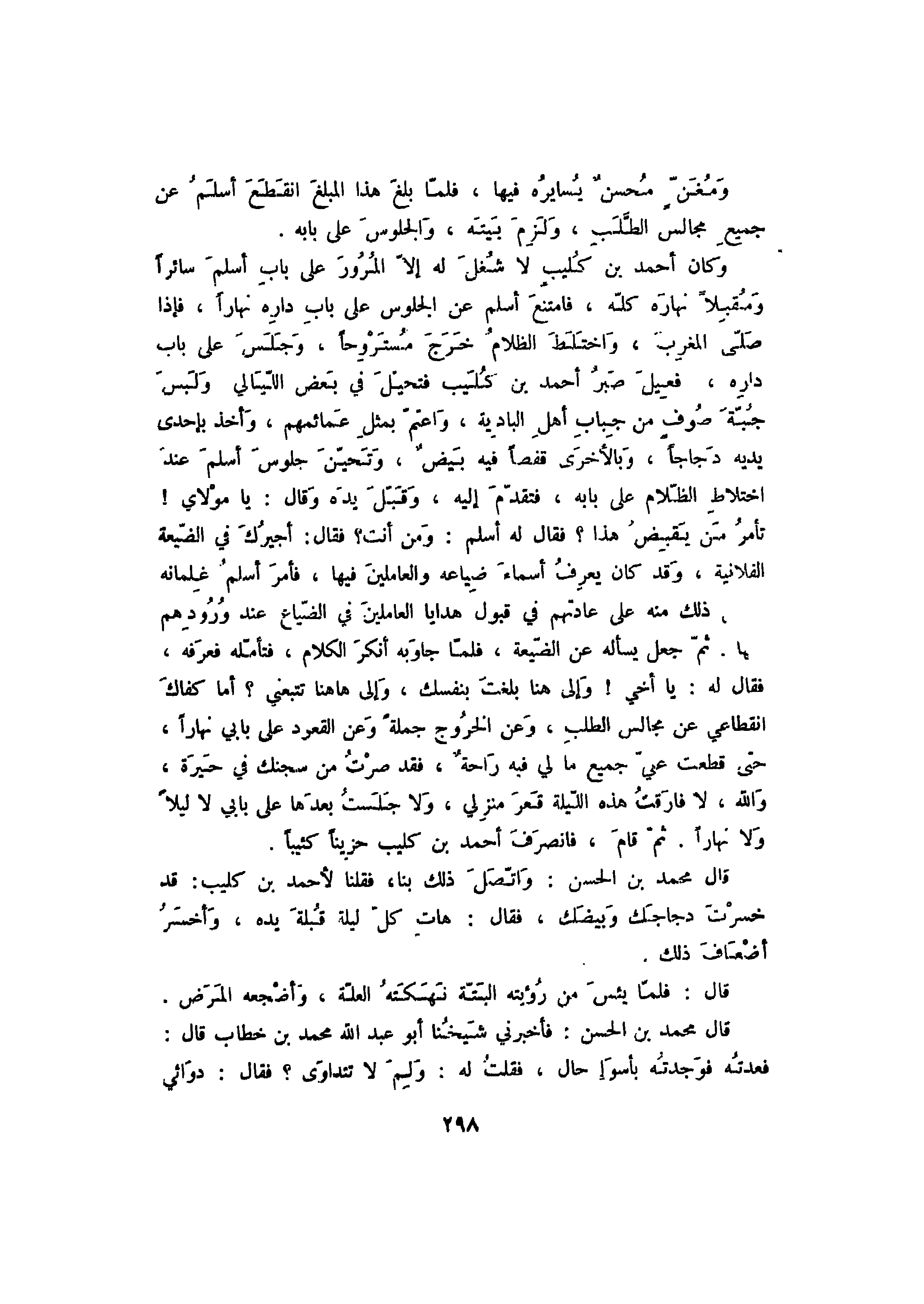 وكان أحمد بن كليب لا شغل له إلا المرور على باب أسلم سائراً ومقبلاً نهاره كله، فامتنع أسلم عن الجلوس على باب داره نهاراً، فإذا صلى المغرب، واختلط الظلام خرج مستروحاً، وجلس على باب داره، فعيل صبر أحمد بن كليب فتحيل في بعض الليالي ولبس جبة صوف من جباب أهل البادية، واعتم بمثل عمائمهم، وأخذ بإحدى يديه دجاجاً، وبالأخرى قفصاً فيه بيض، وتحين جلوس أسلم عند اختلاط الظلام على بابه، فتقدم إليه، وقبل يديه وقال: يا مولا! تأمر من يقبض هذا؟ فقال له أسلم: ومن أمن؟ فقال: أجيرك في الضيعة الفلانية، وقد كان يعرف أسماء ضياعه والعاملين فيها، فأمر أسلك غلمانه ذلك منه على عادتهم في قبول هدايا العاملين في الضياع عند ورودهم ثم جعل يسأله عن الضيعة، فلما جاوبه أنكر الكلام، فتأمله فعرفه، فقال له: يا أخي! وإلى هنا بلغت بنفسك، وإلى ها هنا تتبعني؟ أما كفاك انقطاعي عن مجالس الطلب، وعن الخروج جملةً وعن القعود على بابي نهاراً، حتى قطعت عني جميع ما لي فيه راحة، فقد صرت من سجنك في حيرة، والله، لا فارقت هذه الليلة قعر منزلي، ولا جلست بعدها على بابي لا ليلاً ولا نهاراً. ثم قال، فانصرف أحمد بن كليب حزيناً كئيباً.