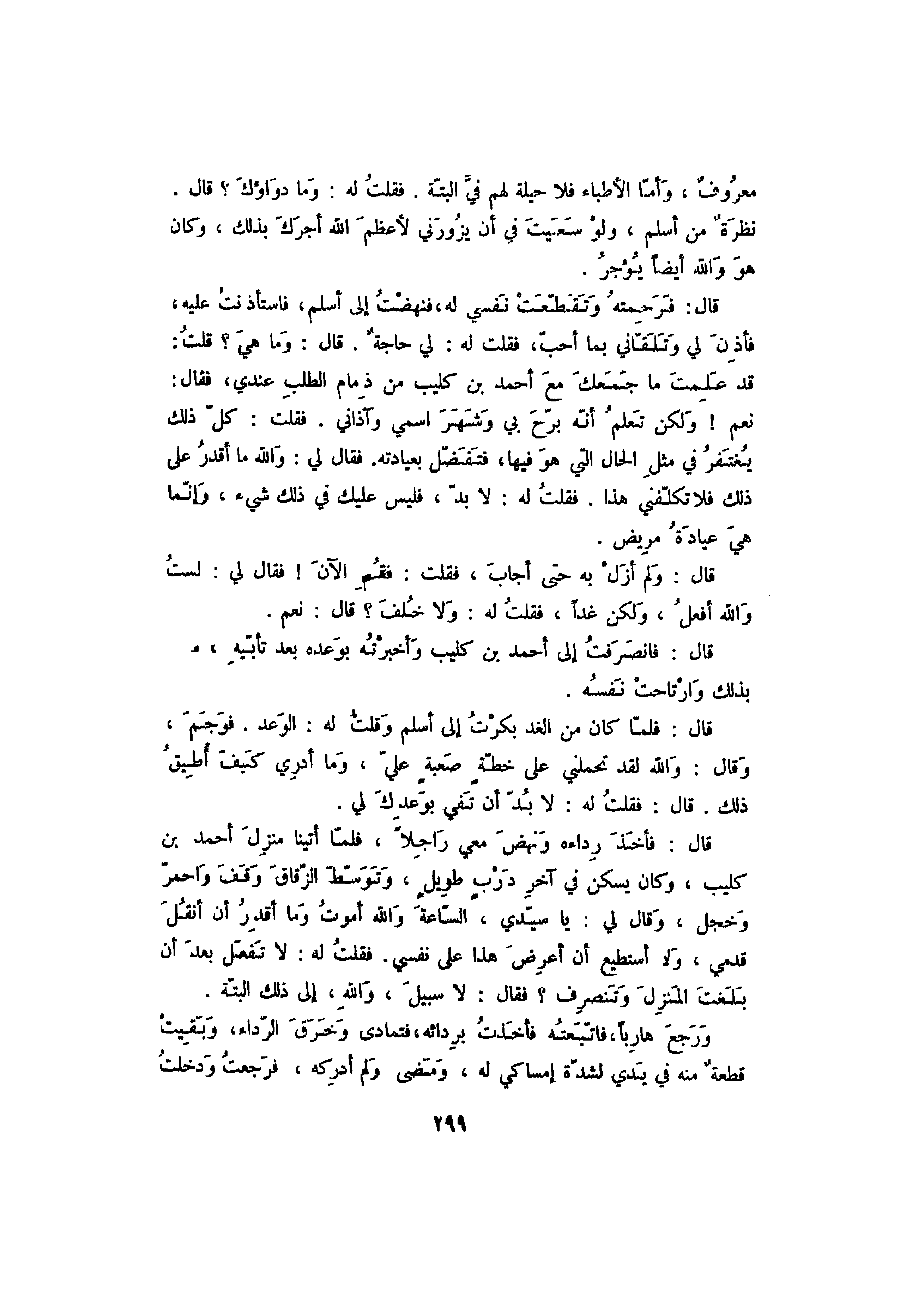 قال: فرحمته وتقطعت نفسي له، فنهضت إلى أسلم، فاستأذنت عليه، فأذن لي وتلقاني بما أحب، فقلت له: لي حاجة. قال: وما هلي؟ قلت: قد علمت ما جمعك مع أحمد بن كليب من ذمام الطلب عندي، فقال: نعم! ولكن تعلم أنه برح بي وشهر اسمي وآذاني. فقلت: كل ذلك يغتفر في مثل الحال التي هو فيها، فتفضل بعيادته. فقال لي: والله ما أقدر على ذلك فلا تكلفني هذا. فقلت له: لا بد، فليس عليك في ذلك شيء، وإنما هي عيادة مريض.