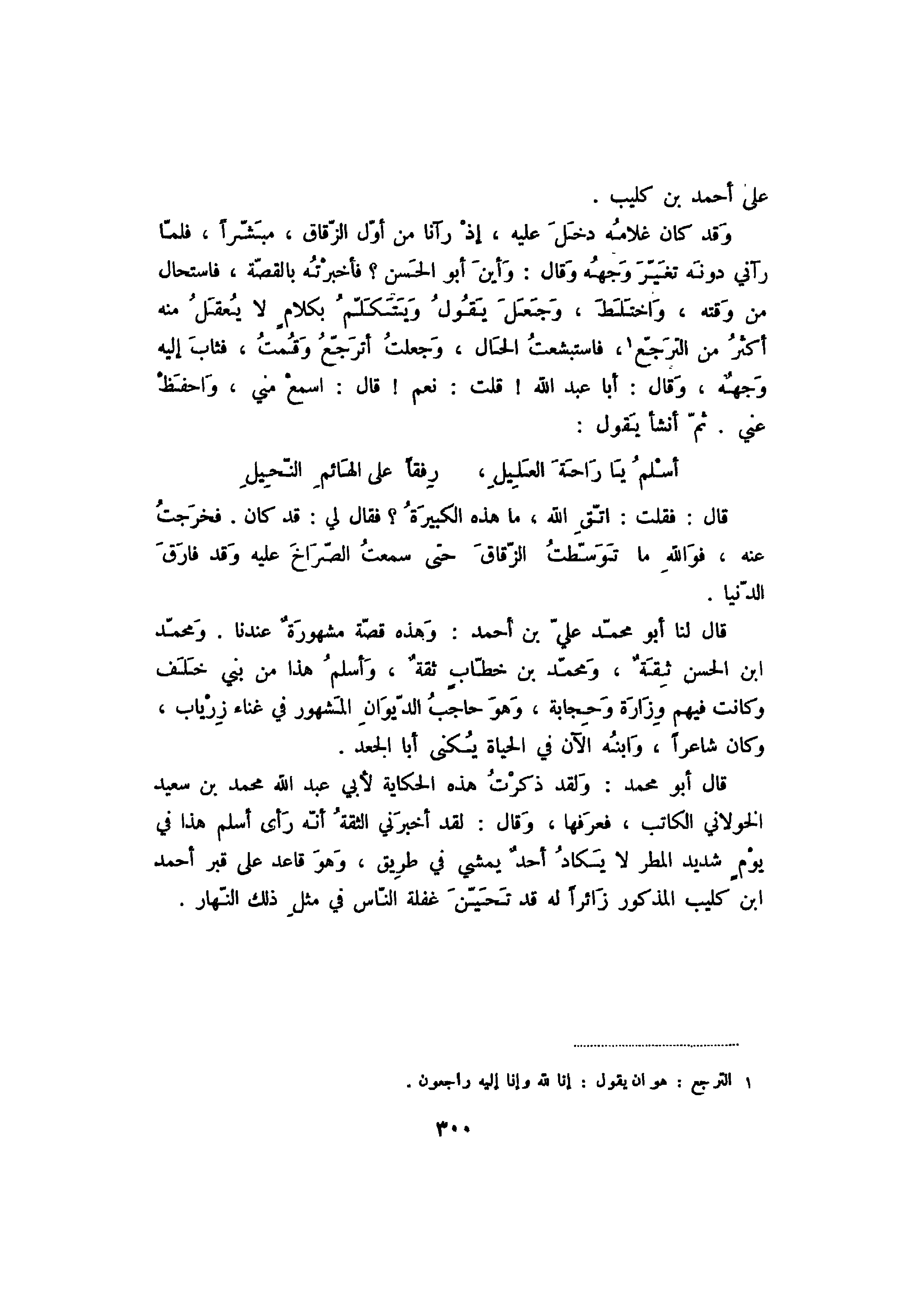 قال أبو محمد: ولقد ذكرت هذه الحكاية لأبي عبد الله محمد بن سعيد الخولاني الكاتب، فعرفها، وقال: لقد أخبرني الثقة أنه رأى أسلم هذا في يوم شديد الكطر لا يكاد أحد يمشي في طريق، وهو قاعد على قبر أحمد بن كليب المذكرو زائراً له قد تحين غفلة الناس في مثل ذلك النهار.