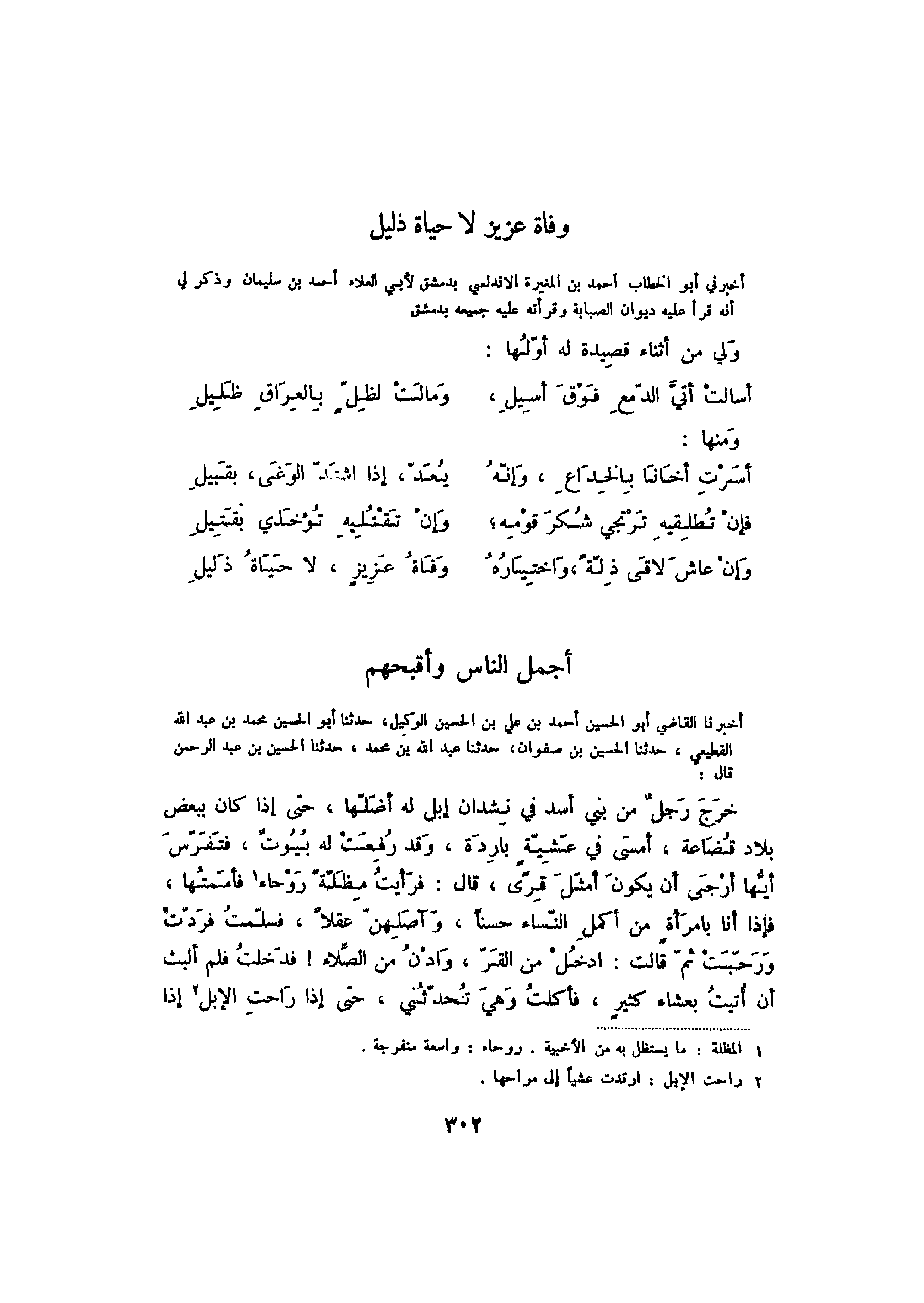أخبرنا القاضي أبو الحسين أحمد بن علي بن الحسين الوكيل، حدثنا أبو الحسين محمد بن عبد الله القطيعي، حدثنا الحسين بن صفوان، حدثنا عبد الله بن محمد، حدثنا الحسين بن عبد الرحمن قال: خرج رجل من بين أسد في نشدان إبل له أضلاه، حتى إذا كان ببعض بلاد قضاعة، أمسى في عشية باردة، وقد رفعت له بيوت، فتفرس أيها أرجى أن يكون أمثل قرىً، قال: فرأيت مظلة روحاء فأممتها، فإذا بامرأة من أكمل النساء حسناً، وآصلهن عقلاً، فسلمت فردت ورحبت ثم قالت: ادخل من القر، وادن من الصلاة! فدخلت فلم ألبث أن أتيت بعشاء كثير، فأكلت وهي تحدثني، حتى إذا راحت الإبل إذا