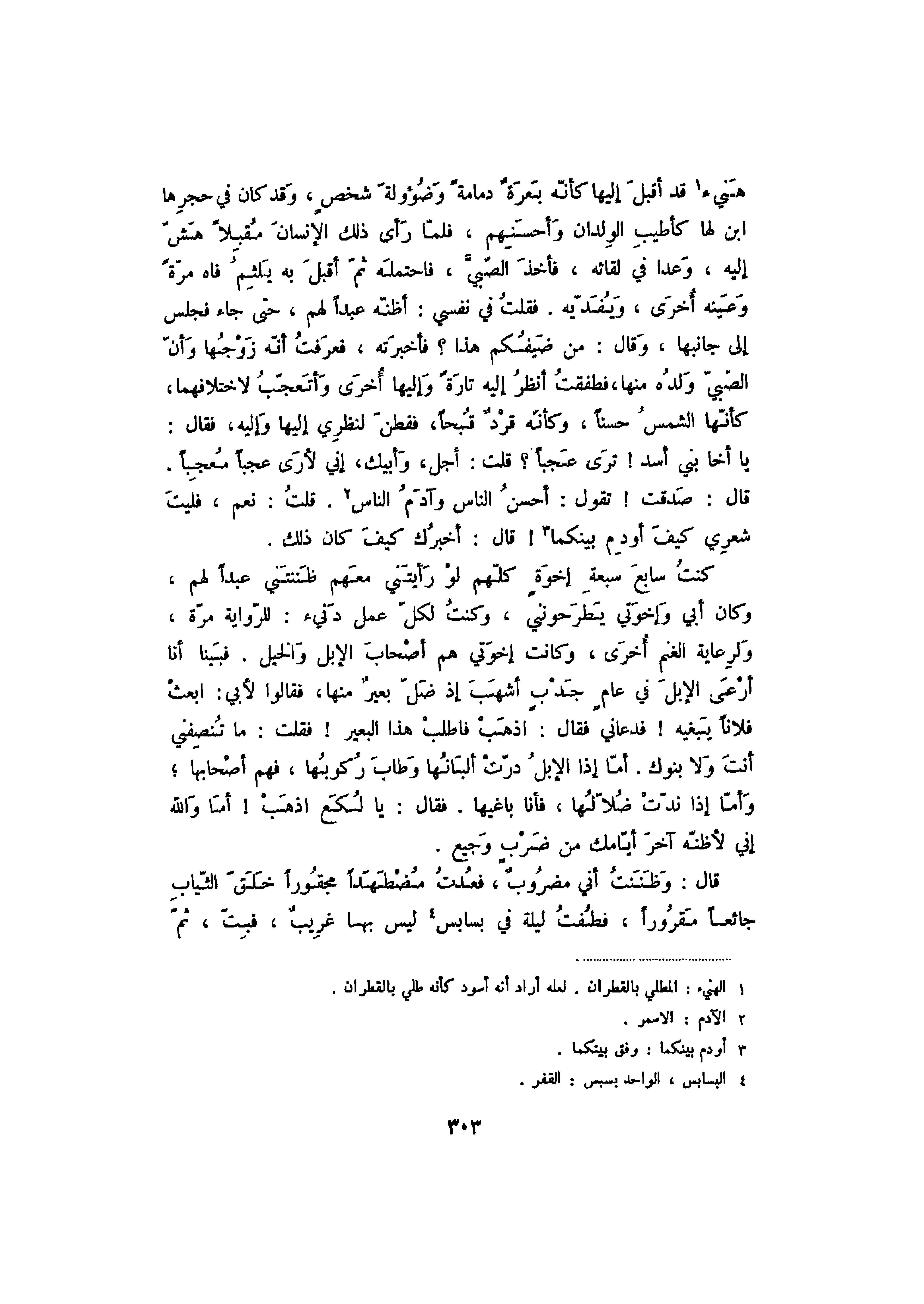 هنيء قد أقبل إليها كأنه بعرة دمامةً وضؤولة شخص، وذد كان في حجرها ابن لها كأطيب الولدان وأحسنهم، فلما رأى ذلك الإنسان مقبلاً هش إليه، وعدا في لقائه، فأخذ الصبي، فاحتمله ثم أقبل به يلثم فاه مرةً وعينه أخرى، ويفديه. فقلت في نفسي: أظنه عبداً لهم، حتى جاء فجلس إلى جانبها، وقال: من ضيفكم هذا؟ فأخبرته، فعرفت أنه زوجها وأن الصبي ولده منها، فطفقت أنظر إليه تارةً وإليها أخرى وأتعجب لاختلافهما، كأنها الشمس حسناً، وكأنه قرد قبحاً، ففطن لنظري إليها وإليه، فقال: يا أخا بين أسد! ترى عجباً؟ قلت: أجل، وأبيك، إني لأرى عجباً معجباً.