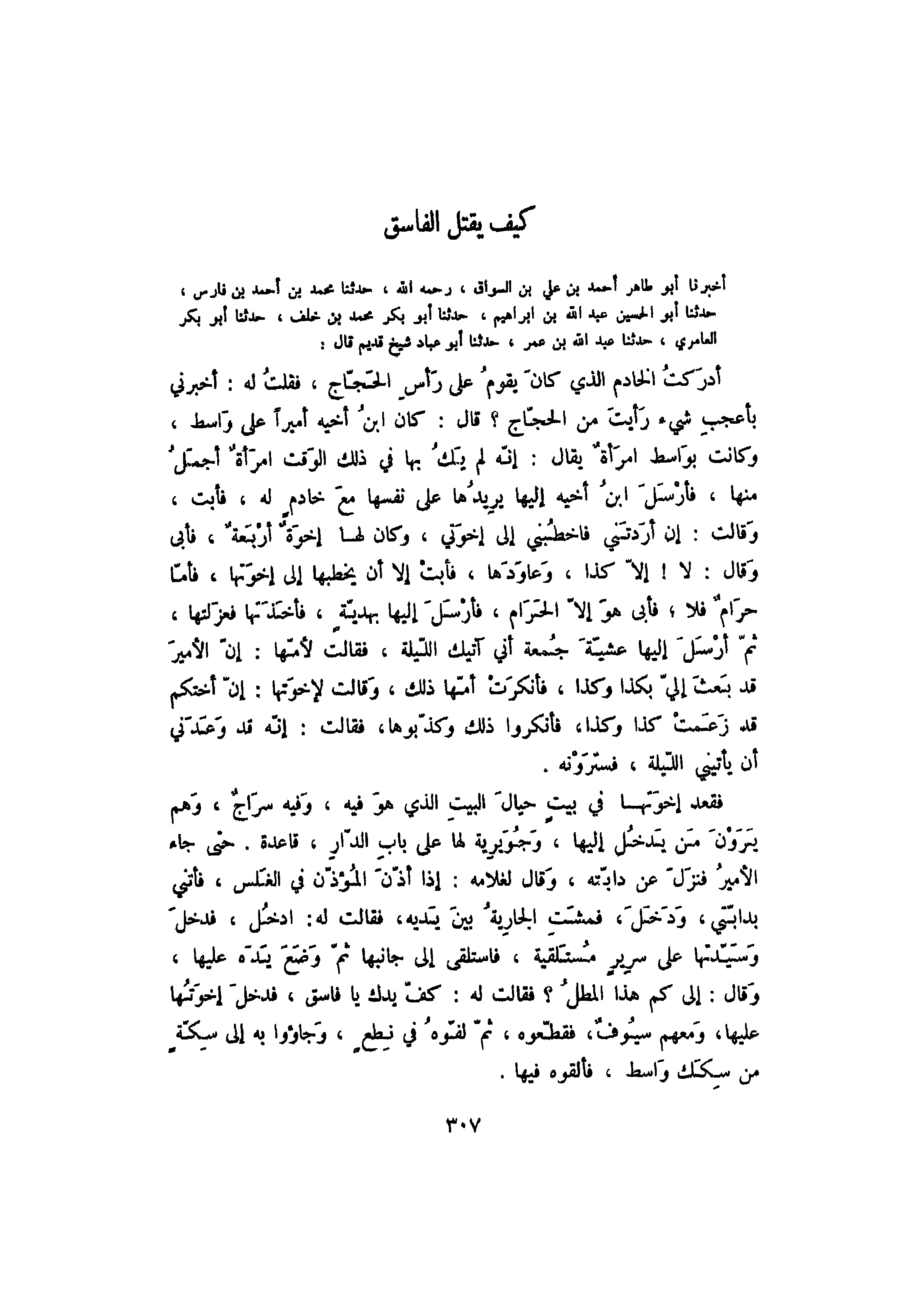 أخبرنا أبو طاهر أحمد بن علي بن السواق، رحمه الله، حدثنا محمد بن أحمد بن فارس، حدثنا أبو الحسين عبد الله بن إبراهيم، حدثنا أبو بكر محمد بن خلف، حدثنا أبو بكر العامري، حدثنا عبد الله بن عمر، حدثنا أبو عباد شيخ قديم قال: أدركت الخادم الذي كان يقوم على راس الحجاج، فقلت له: أخبرني بأعجب شيء رأيت من الحجاج؟ قال: كان أميراً على واسط، وكانت بواسط امرأة يقال: إنه لم يك بها في ذلك الوقت امرأة أجمل منها، فأرسل ابن أخيه إليها يريدها على نفسها مع خادم له، فأبت، وقالت: إن أردتني فاخطبني إلى أخوتي، وكان لها أخوة أربعة، فأبى وقال: لا! إلا كذا، وعاودها، فأبت إلا أن يخطبها إلى أخوتها، فأما حرام فلا، فأبى هو إلا الحرام، فأرسل إليها بهدية، فأخذتها فعزلتها، ثم أرسل إليها عشية جمعة أني آتيك الليلة، فقالت لأمها: إن الأمير قد بعث إلي بكذا وكذا، فأنكرت أمها ذلك، وقالت لأخوتها: إن أختكم قد زعمت كذا وكذا، فأنكروا ذلك وكذبوها، فقالت: إنه قد وعدني أن يأتيني الليلة، فسترونه.