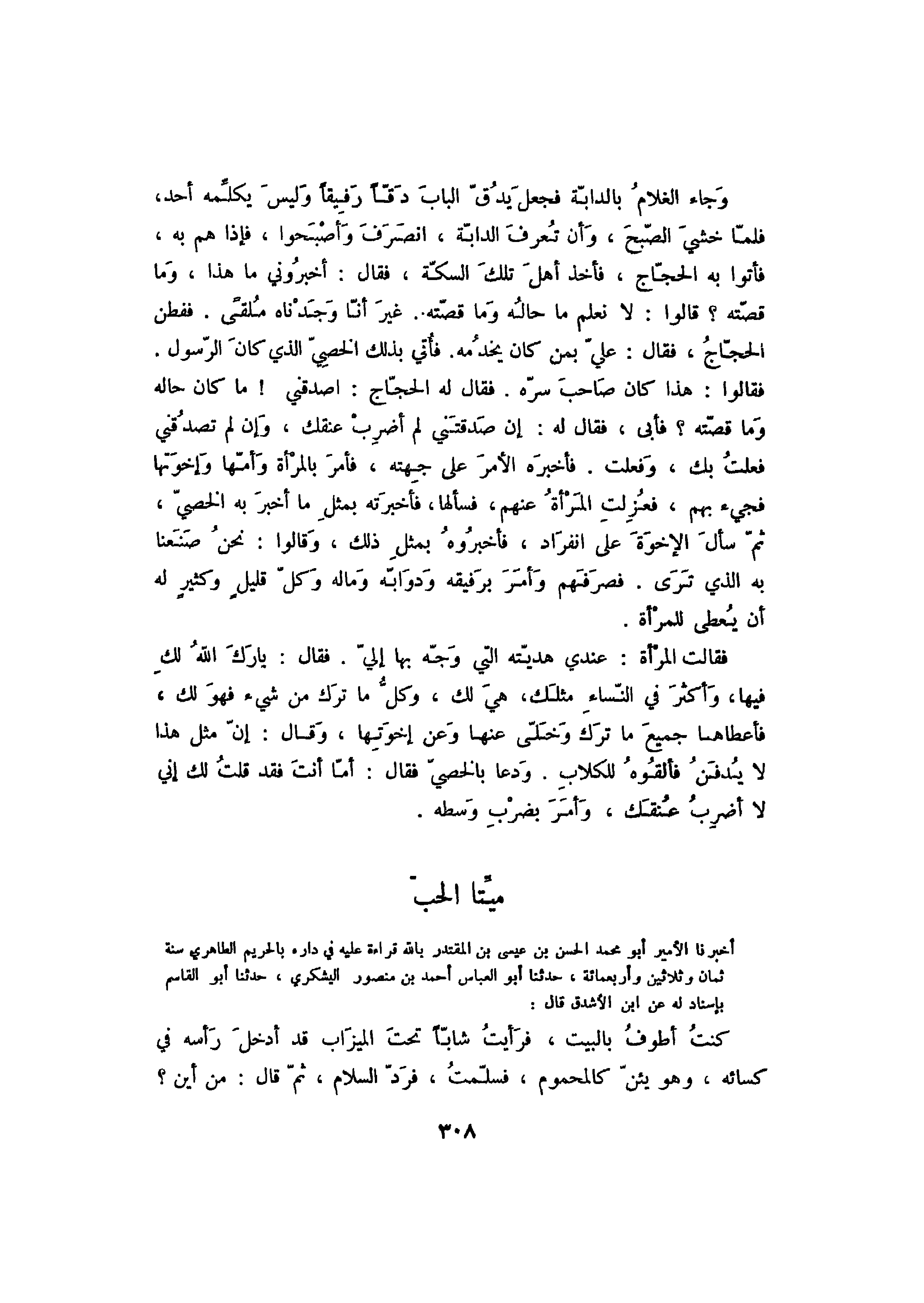 وجاء الغلام بالدابة فجعل يدق الباب دقاً رفيقاً وليس يكلمه أحد، فلما خشي الصبح، وأن تعرف الدابة، انصرف وأصبحوا، فإذا هم به، فأتوا له الحجاج، فأخذ أهل تلك السكة، فقال: أخبروني ما هذا. وما قصته؟ قالوا: لا نعلم ما حاله وما قصته. غير أنا وجدناه ملقىً. ففطن الحجاج، فقال: علي بمن كان يخدمه. فأتي بذلك الخصي الذي كان الرسول. فقالوا: هذا كان صاحب سره. فقال له الحجاج: اصدقني! ما كان حاله وما فصته؟ فأبى، فقال له: إن صدقتني لم أضرب عنقك، وإن لم تصدقني فعلت بك، وفعلت. فأخبره الأمر على جهته، فأمر بالمرأة وأمها وأخوتها فجيء بهم، فعزلت المرأة عنهم، فسألها فأخبرته بمثل ما اخبر به الخصي، ثم سأل الأخوة على انفراد، فأخبروه بمثل ذلك، وقالوا: حن صنعنا به الذي ترى. فصرفهم وأمر برفيقه ودوابه وماله وكل قليل وكثير له أن يعطى للمرأة.