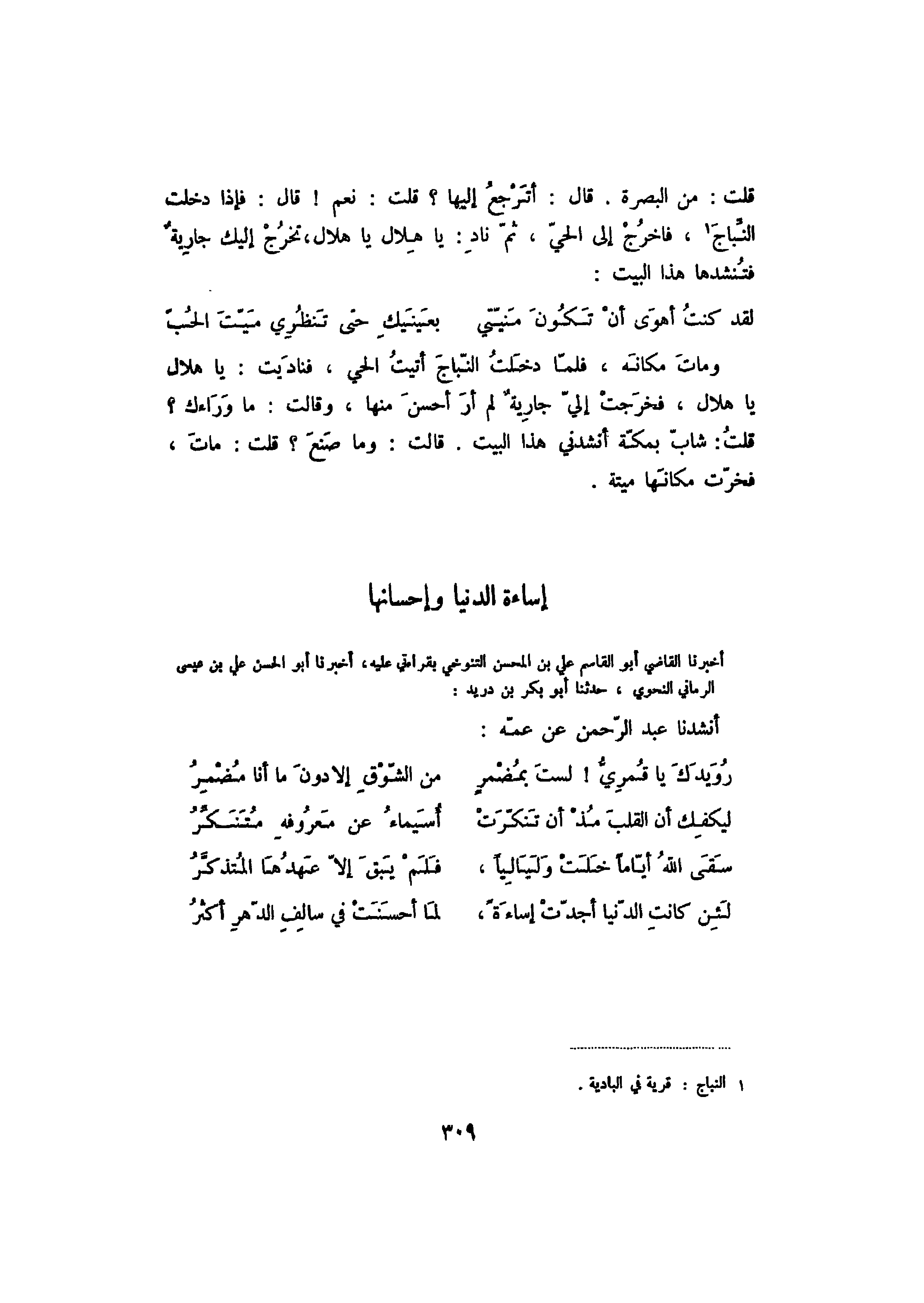 قلت: من البصرة. قال:؟ أترجع إليها؟ قلت: نعم! قال: فإذا دخلت النباج، فاخرج إلي الحي، ثم ناد: يا هلال يا هلال، تخرج إليك جارية فتنشدها هذا البيت: