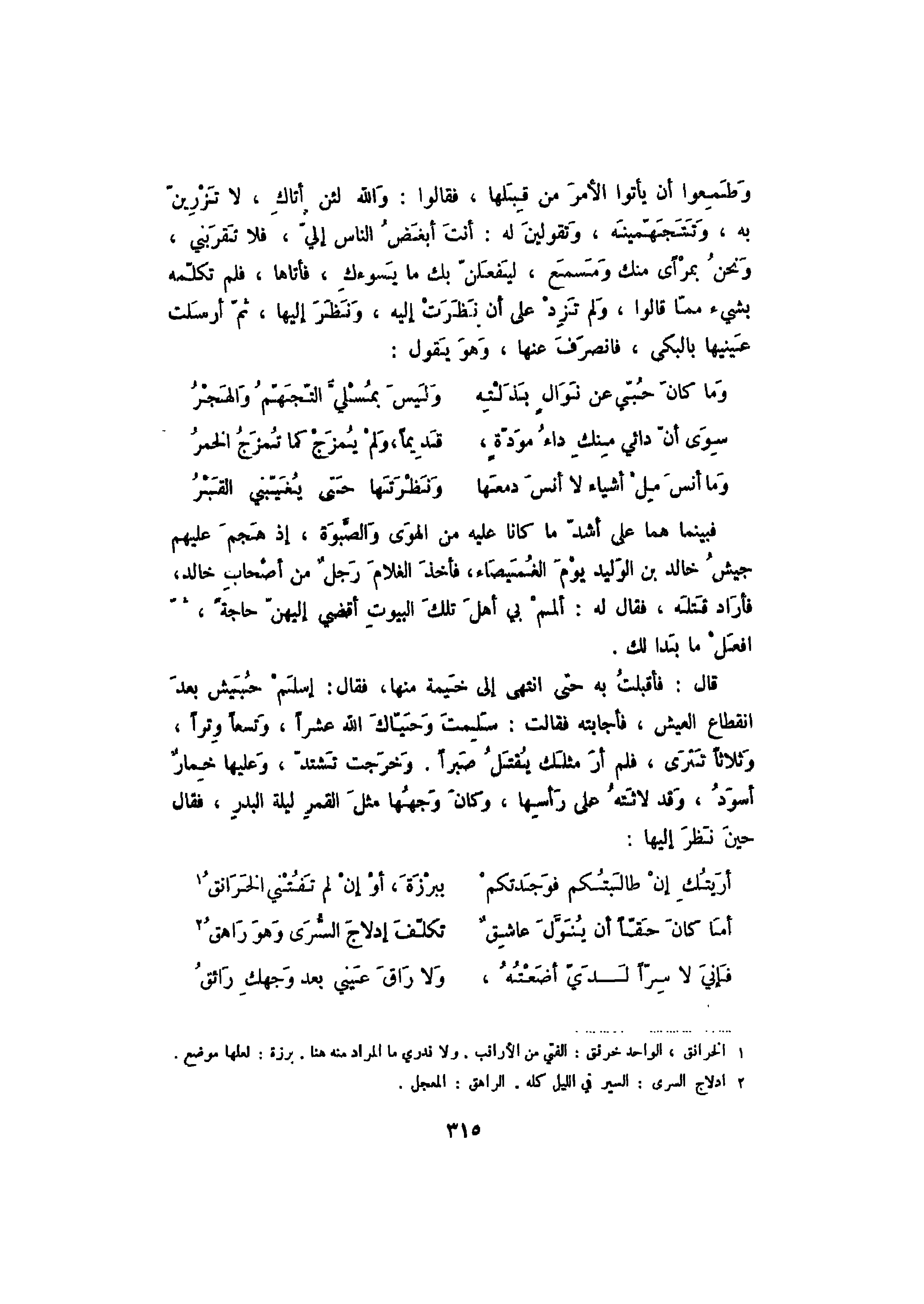 قال: فأقبلت به حتى انتهى إلى خيمة منها، فقال: إسلم حبيش بعد انقطاع العيش، فأجابته فقالت: سلمت وحياك الله عشراً، وتسعاً وتراً، وثلاثاً تترى، فلم أر مثلك يقتل صبراً. وخرجت تشتد، وعليها خمار أسود، وقد لاثته على رأسها، وكان وجهها مثل القمر ليلة البدر، فقال حين نظر إليها: