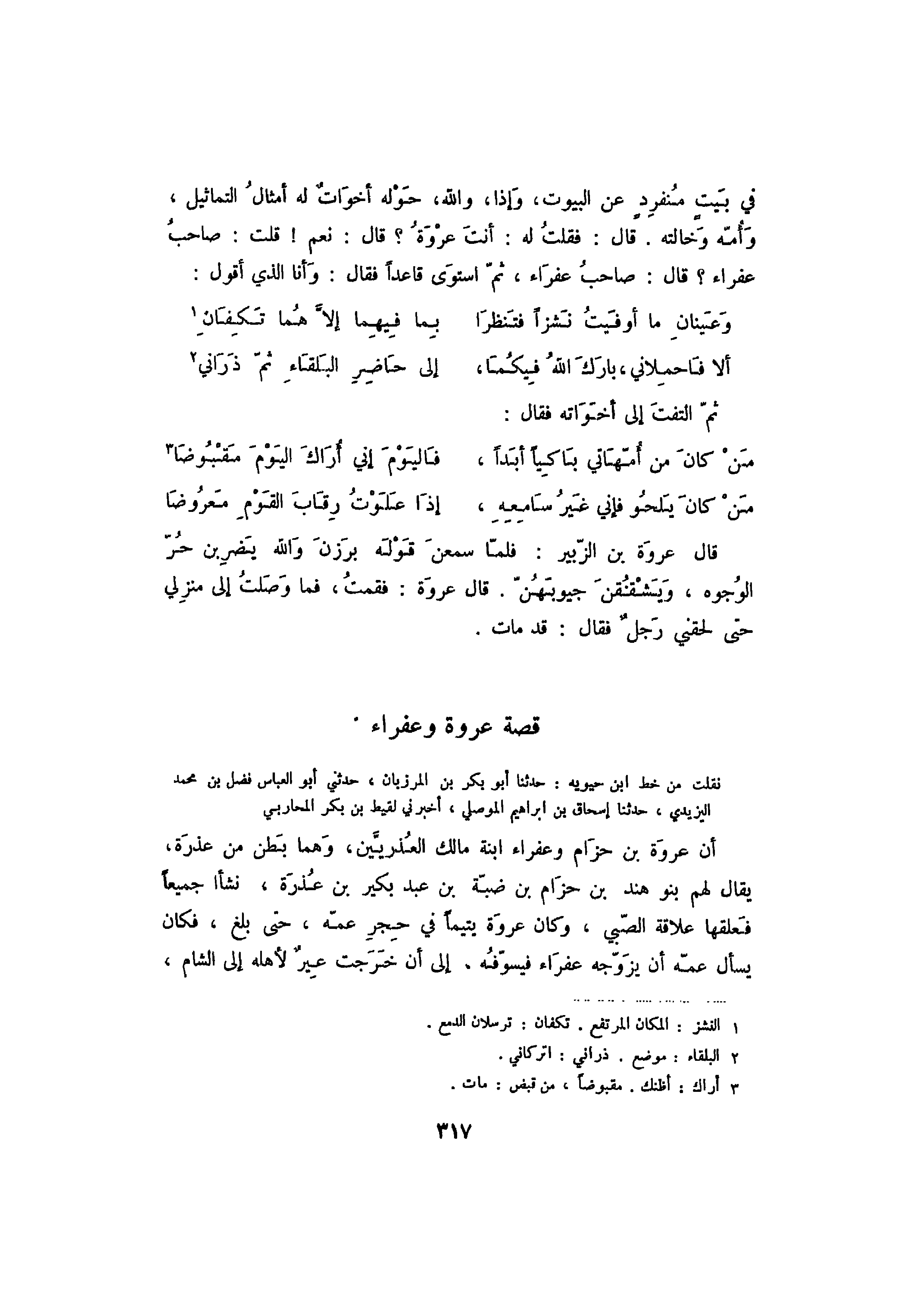 في بيت منفرد عن البيوت، وإذا، والله، حوله أخوات له أمثال التماثيل، وأمه وخالته. قال: فقلت له: أنت عروة؟ قال: نعم! قلت: صاحب عفراء؟ قال: صاحب عفراء، ثم استوى قاعداً فقال: وأنا الذي أقول:
