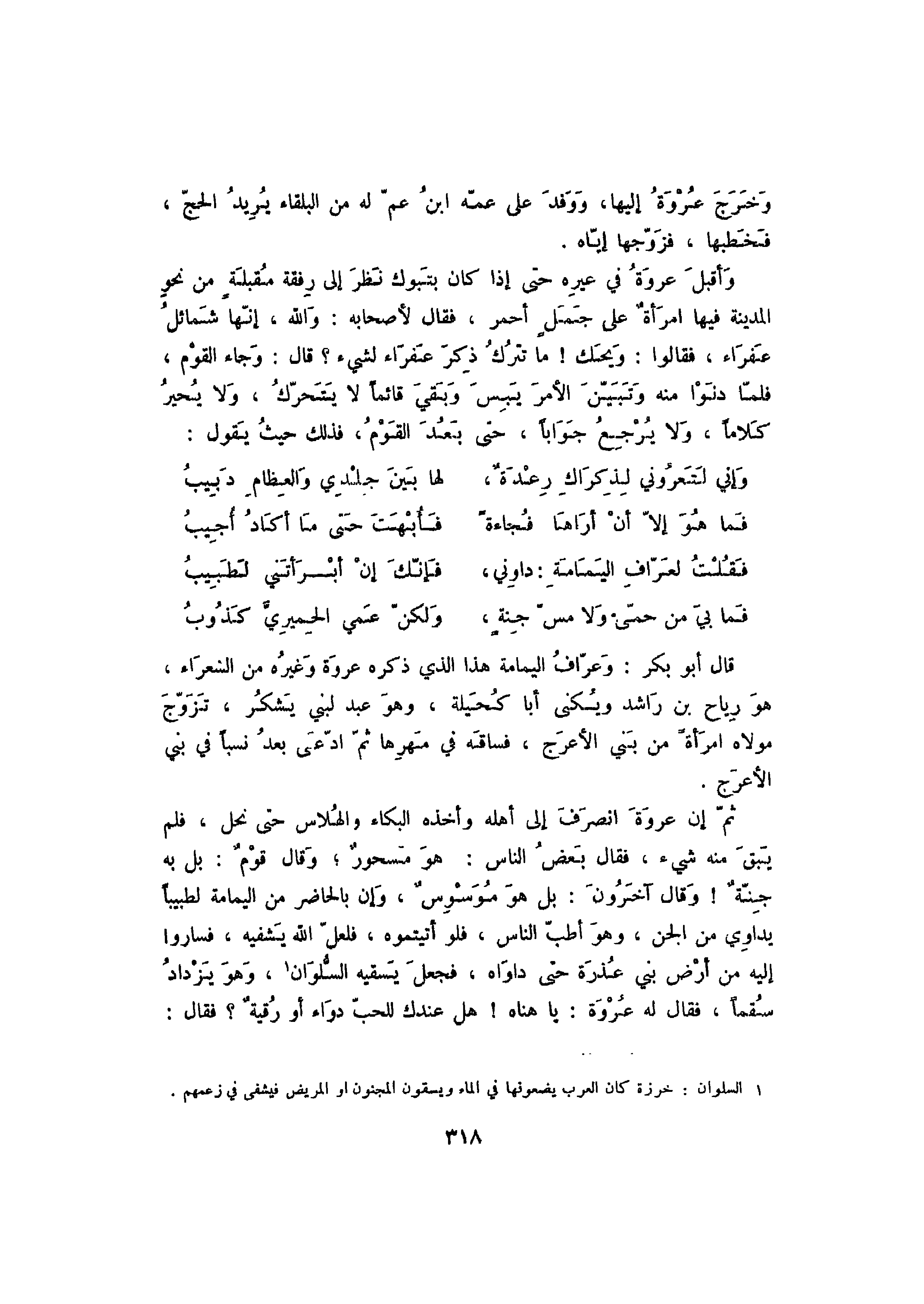 وخرج عروة إليها، ووفد على عمه ابن عم له من البلقاء يريد الحج، فخطبها، فزوجها إياه.