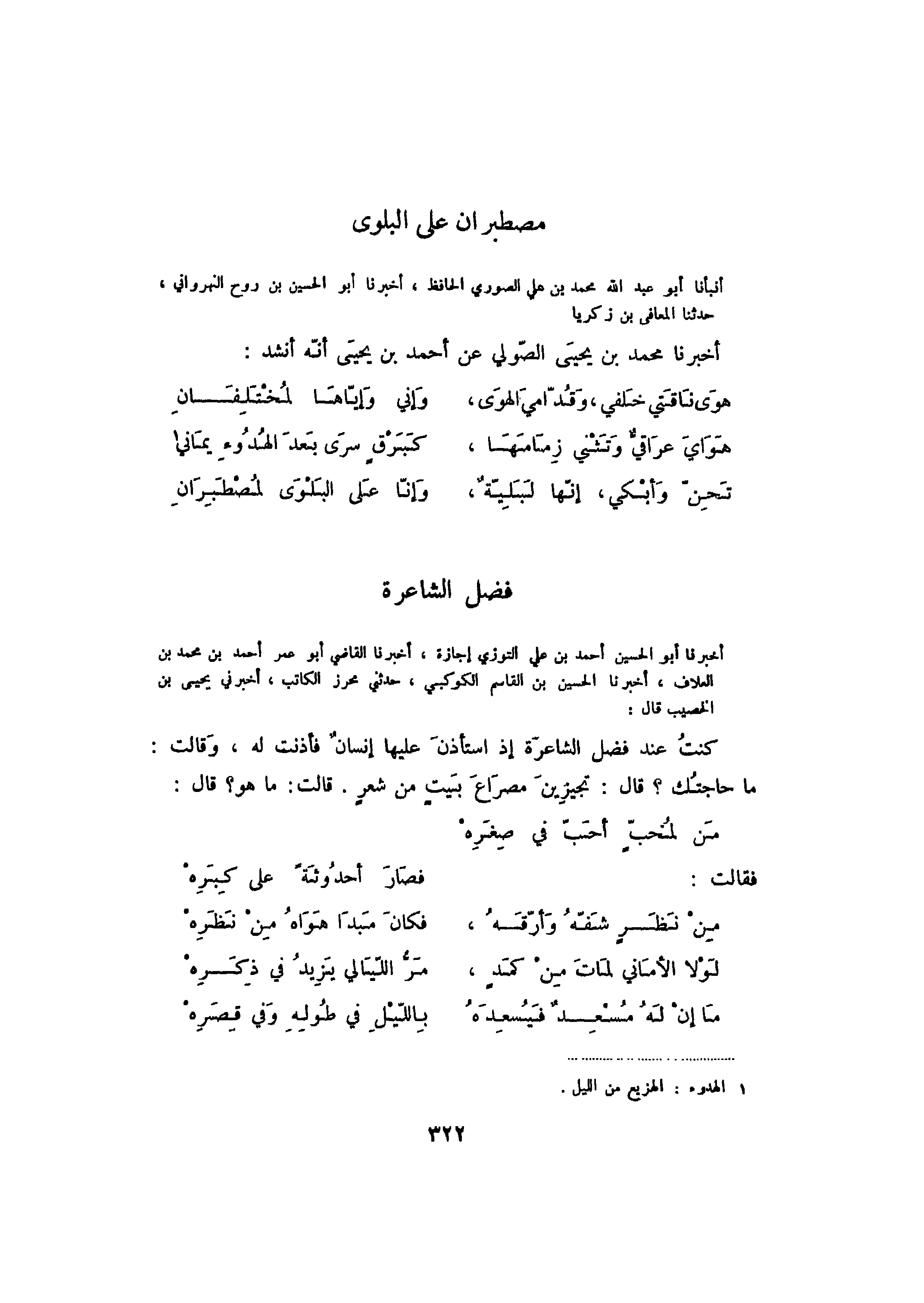 أنبأنا أبو عبد الله محمد بن علي الصوري الحافظ، أخبرنا أبو الحسين بن روح النهرواني حدثنا المعافى بن زكريا: أخبرنا محمد بن يحيى الصولي عن أحمد بن يحيى أنه أنشد: