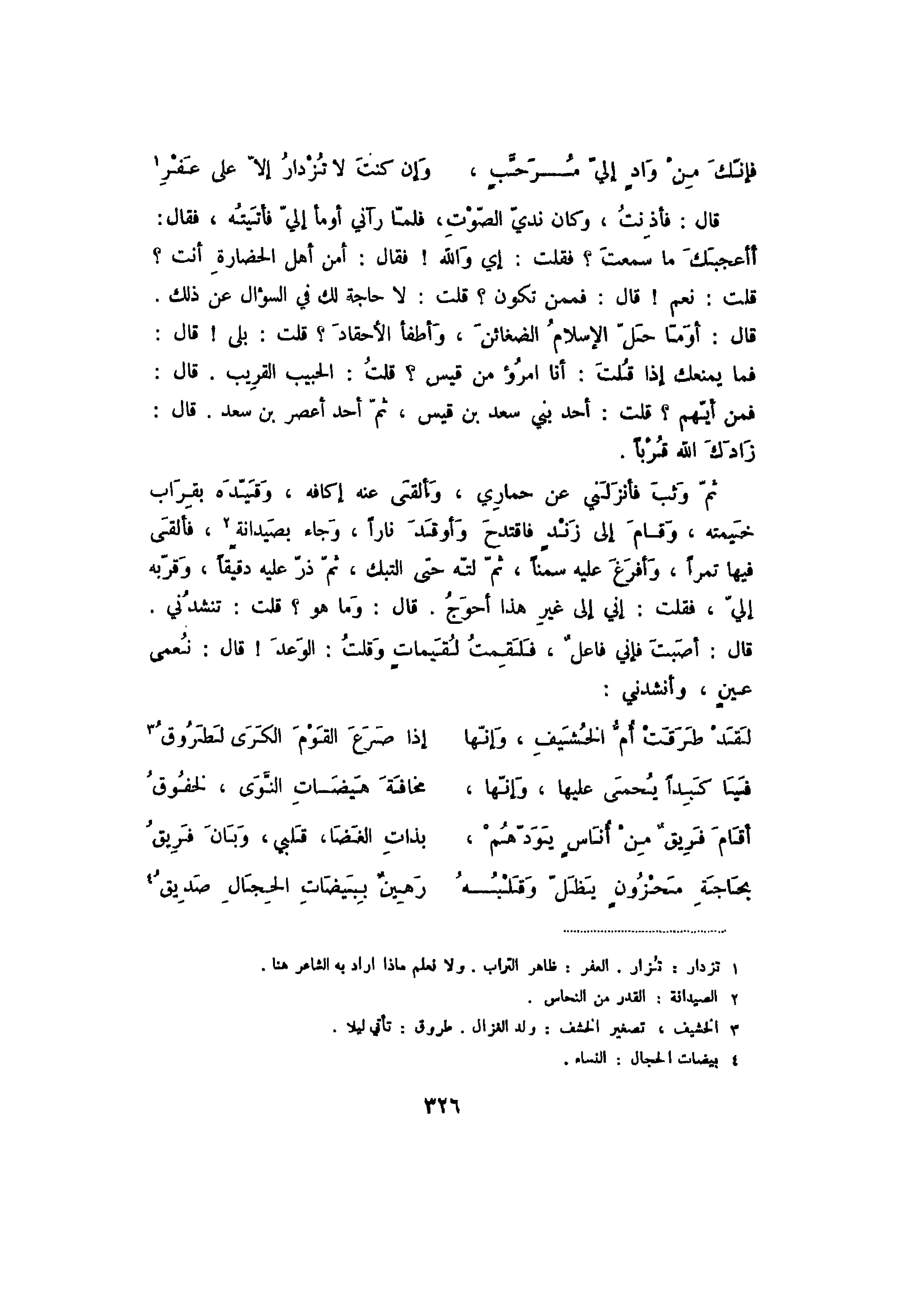ثم وثب فأنزلني عن حماري، وألقى عنه إكافه، وقيده بقراب خيمته، وقام إلى زند فاقتدح وأوقد ناراً، وجاء بصيدانو، فألقى فيها تمراً، وأفرغ عليه سمناً، ثم لته حتى التبك، ثم ذر عليه دقيقاً، وقربه إلي، فقلت: إني إلى غير هذا أحوج. قال: وما هو؟ قلت: تنشدني. قال: أصبت فإني فاعل، فلقمت لقيمات وقلت: الوعد! قال: نعمى عين وأنشدني: