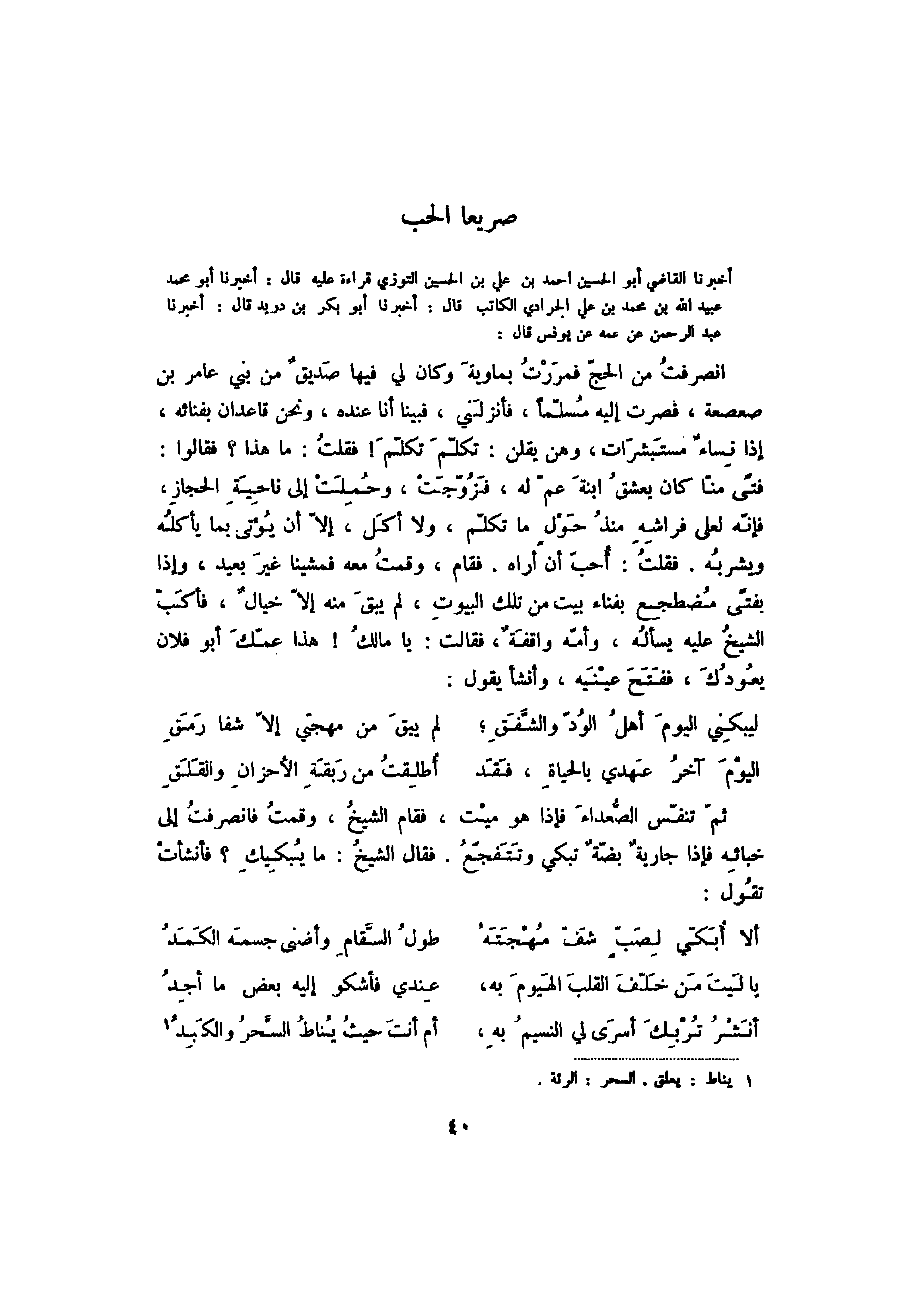 أخبرنا القاضي أبو الحسين أحمد بن علي بن الحسين التوزي قراءة عليه قال: أخبرنا أبو محمد عبيد الله بن محمد بن علي الجرادي الكاتب قال: أخبرنا أبو بكر بن دريد قال: أخبرنا عبد الرحمن عن عمه عن يونس قال: انصرفت من الحج فمررت بماوية وكان لي فيها صديق من بني عامر بن صعصعة، فصرت إليه مسلماً، فأنزلني، فبينا أنا عنده، ونحن قاعدان بفنائه، إذا نساءٌ مستبشرات، وهن يقلن: تكلم تكلم! فقلت: ما هذا؟ فقالوا: فتىً منا كان يعشق ابنة عم له، فزوجت، وحملت إلى ناحية الحجاز، فإنه لعلى فراشه منذ حول ما تكلم، ولا أكل، إلا أن يؤتى بما يأكله ويشربه. فقلت: أحب أن أراه. فقام، وقمت معه فمشينا غير بعيد، وإذا بفتىً مضطجع بفناء بيت من تلك البيوت، لم يبق منه إلا خيال، فأكب الشيخ عليه يسأله، وأمه واقفة، فقالت: يا مالك! هذا عمك أبو فلان يعودك، ففتح عينيه، وأنشأ يقول: