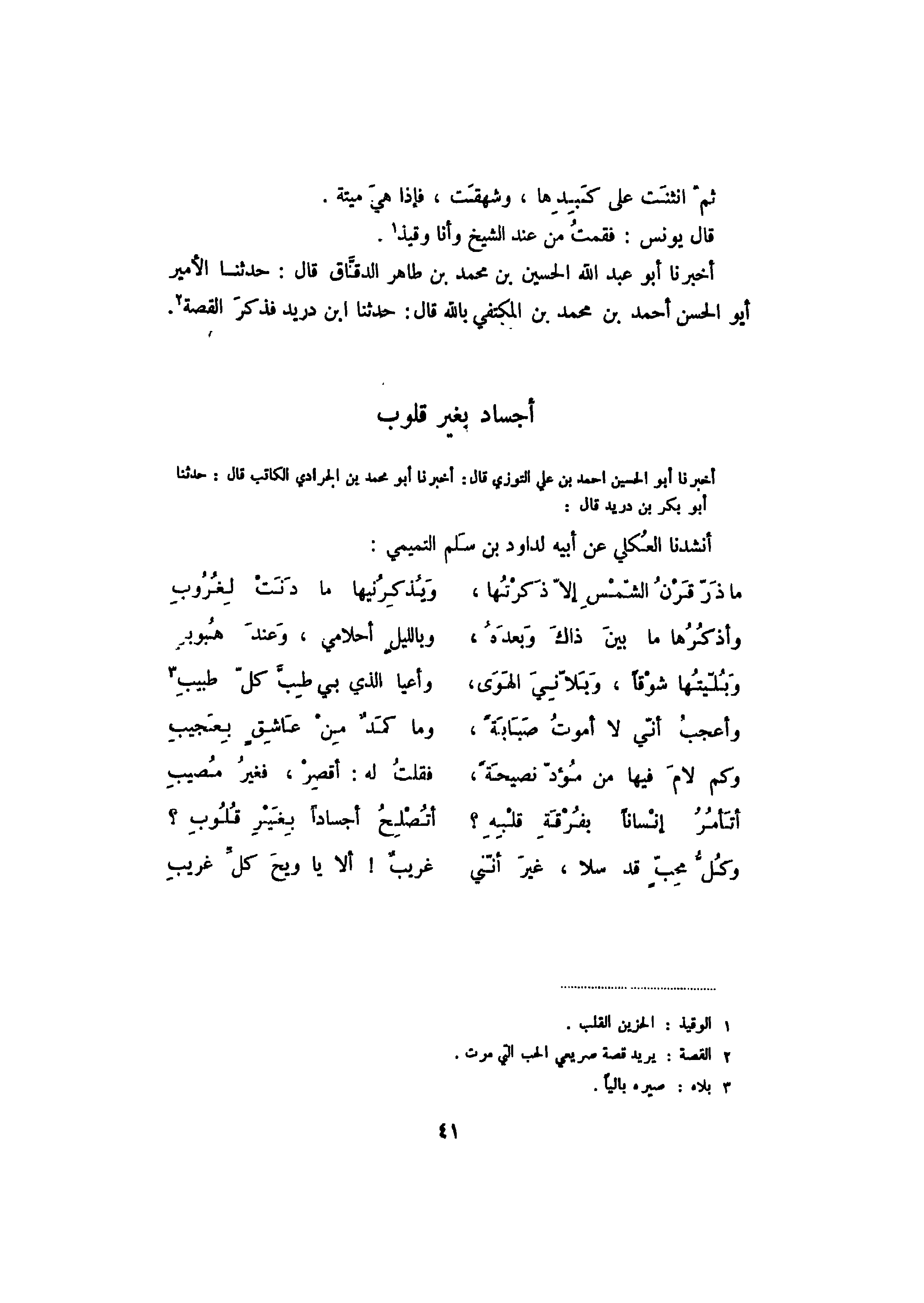 أخبرنا أبو الحسين أحمد بن علي التوزي قال: أخبرنا أبو محمد بن الجرادي الكاتب قال: حدثنا أبو بكر بن دريد قال: أنشدنا العكلي عن أبيه لداود بن سلم التميمي: