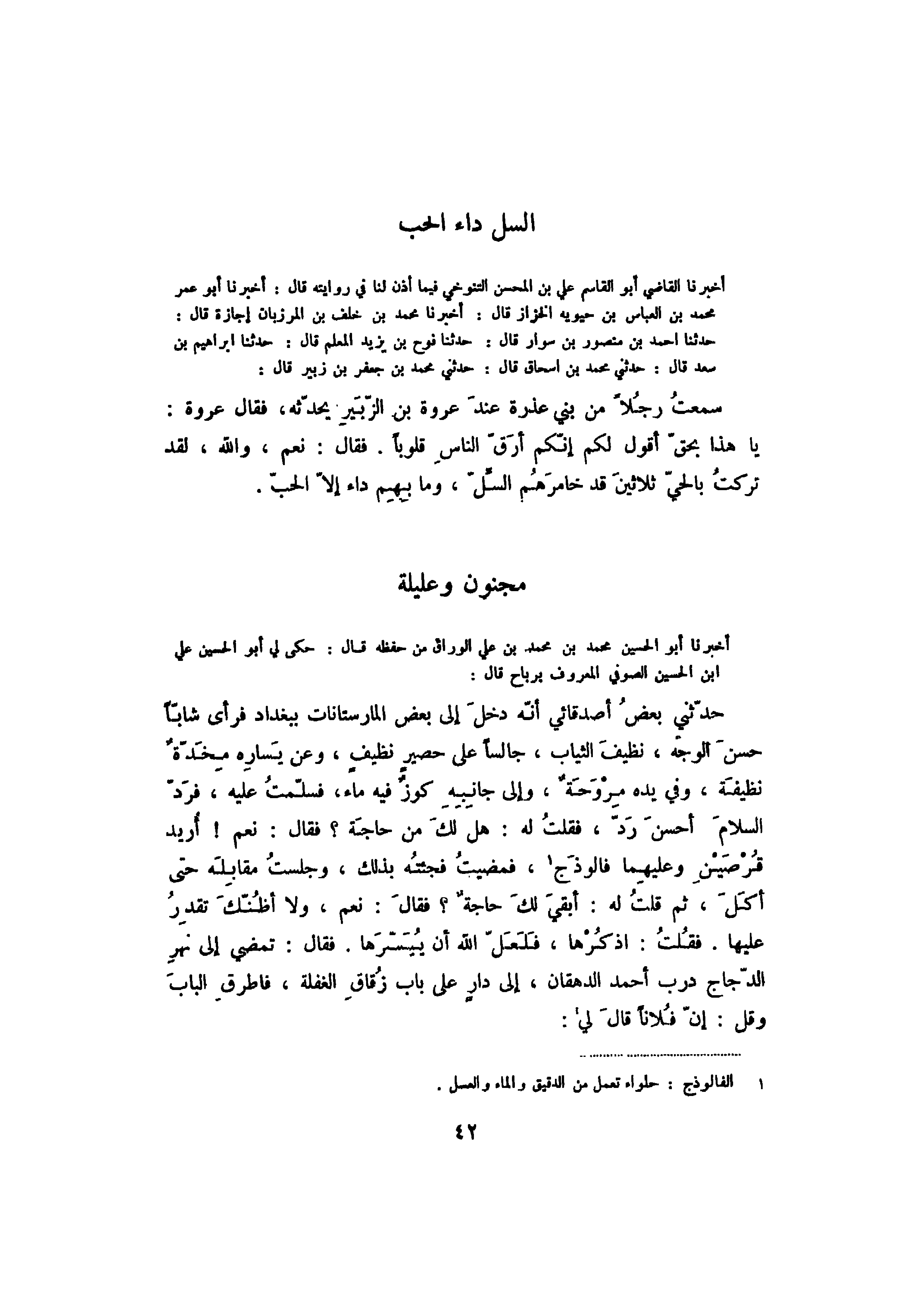 أخبرنا القاضي أبو القاسم علي بن المحسن التنوخي فيما أذن لنا في روايته قال: أخبرنا أبو عمر محمد بن العباس بن حيويه الخزاز قال: أخبرنا محمد بن خلف بن المرزبان إجازة قال: حدثنا أحمد بن منصور بن سوار قال: حدثنا نوح بن يزيد المعلم قال: حدثنا إبراهيم بن سعد قال: حدثني محمد بن إسحاق قال: حدثني محمد بن جعفر بن زبير قال: سمعت رجلاً من بني عذرة عند عروة بن الزبير يحدثه، فقال عروة: يا هذا بحق أقول لكم إنكم أرق الناس قلوباً. فقال: نعم، والله، لقد تركت بالحي ثلاثين قد خامرهم السل، وما بهم داء إلا الحب.