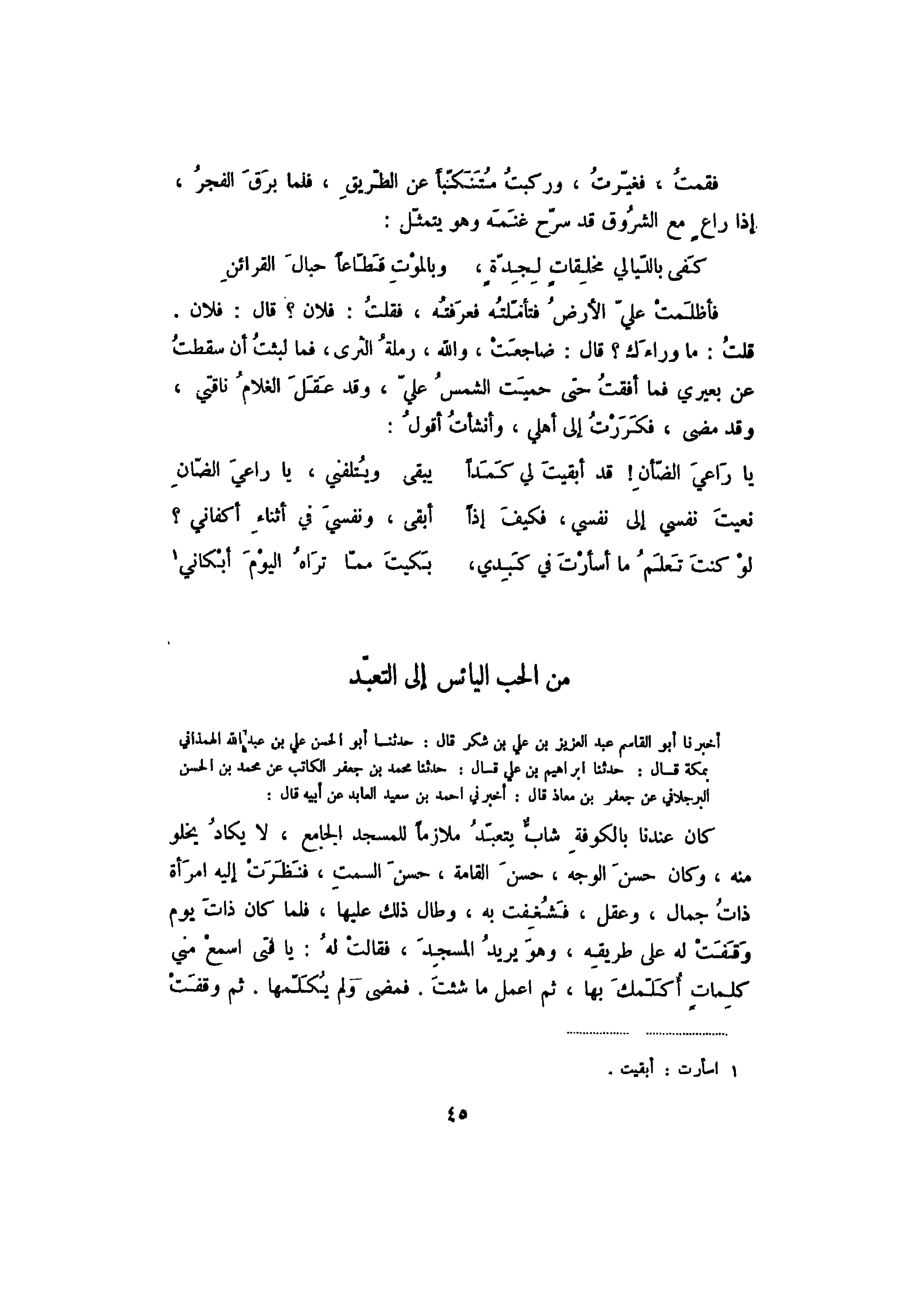 فقمت، فغيرت وركبت متنكباً عن الطريق، فلما برق الفجر، إذا راعٍ مع الشروق قد سرح غنمه وهو يتمثل: